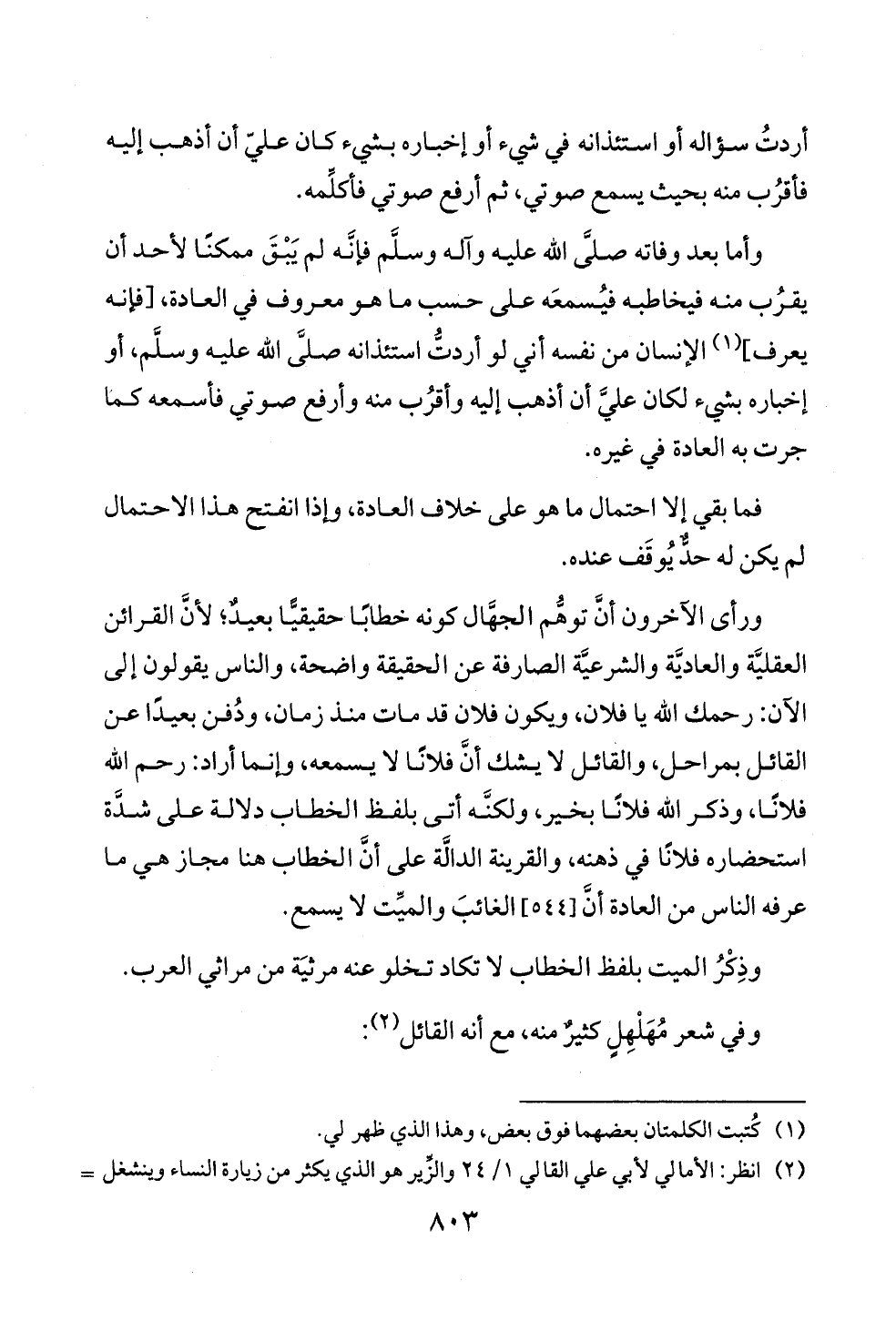 وأما بعد وفاته صلَّى الله عليه وآله وسلَّم فإنَّه لم يَبْقَ ممكنًا لأحد أن يقرُب منه فيخاطبه فيُسمعَه على حسب ما هو معروف في العادة، [فإنه يعرف] (¬١) الإنسان من نفسه أني لو أردتُّ استئذانه صلَّى الله عليه وسلَّم، أو إخباره بشيء لكان عليَّ أن أذهب إليه وأقرُب منه وأرفع صوتي فأسمعه كما جرت به العادة في غيره.