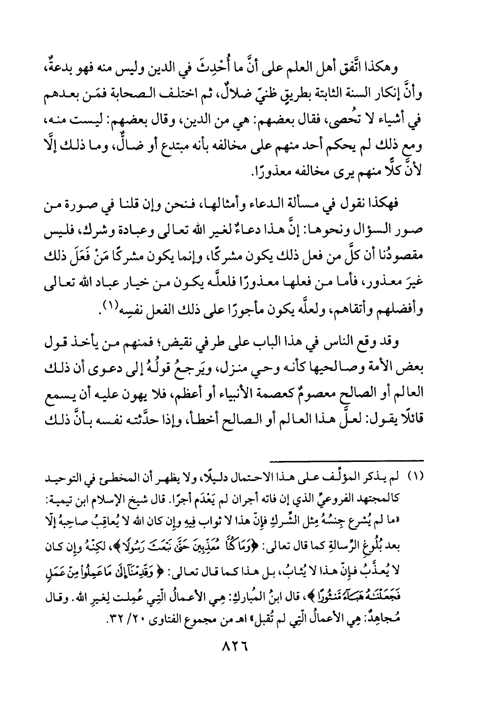 (¬١) لم يذكر المؤلِّف على هذا الاحتمال دليلًا، ولا يظهر أن المخطئ في التوحيد كالمجتهد الفروعيِّ الذي إن فاته أجران لم يَعْدَم أجرًا. قال شيخ الإسلام ابن تيمية: «ما لم يُشرع جِنسُهُ مِثل الشِّركِ فإِنّ هذا لا ثواب فِيهِ وإِن كان الله لا يُعاقِبُ صاحِبهُ إلّا بعد بُلُوغِ الرِّسالةِ كما قال تعالى: {وَمَا كُنَّا مُعَذِّبِينَ حَتَّى نَبْعَثَ رَسُولًا} , لكِنّهُ وإِن كان لا يُعذَّبُ فإِنّ هذا لا يُثابُ، بل هذا كما قال تعالى: {وَقَدِمْنَا إِلَى مَا عَمِلُوا مِنْ عَمَلٍ فَجَعَلْنَاهُ هَبَاءً مَنْثُورًا} , قال ابنُ المُباركِ: هِي الأعمالُ الّتِي عُمِلت لِغيرِ الله. وقال مُجاهِدٌ: هِي الأعمالُ الّتِي لم تُقبل» اهـ من مجموع الفتاوى ٢٠/ ٣٢.