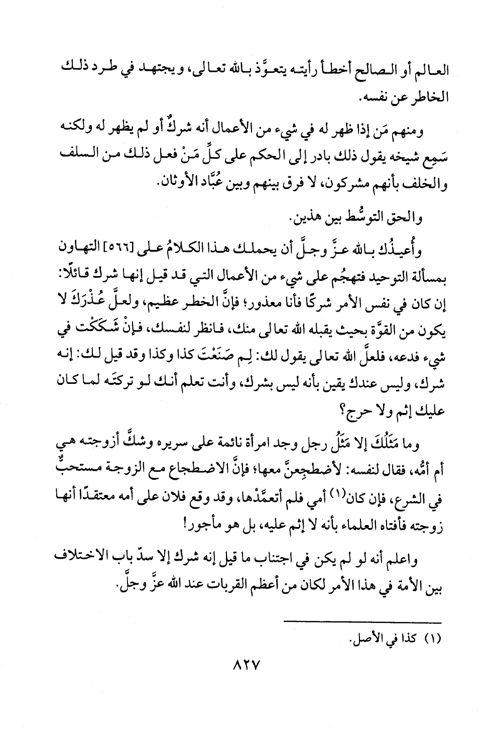 وأُعيذُك بالله عزَّ وجلَّ أن يحملك هذا الكلامُ على [٥٦٦] التهاون بمسألة التوحيد فتهجُم على شيء من الأعمال التي قد قيل إنها شرك قائلًا: إن كان في نفس الأمر شركًا فأنا معذور؛ فإنَّ الخطر عظيم، ولعلَّ عُذْرَكَ لا يكون من القوَّة بحيث يقبله الله تعالى منك، فانظر لنفسك، فإنْ شَكَكْت في شيء فدعه، فلعلَّ الله تعالى يقول لك: لِم صَنَعْتَ كذا وكذا وقد قيل لك: إنه شرك، وليس عندك يقين بأنه ليس بشرك, وأنت تعلم أنك لو تركتَه لما كان عليك إثم ولا حرج؟