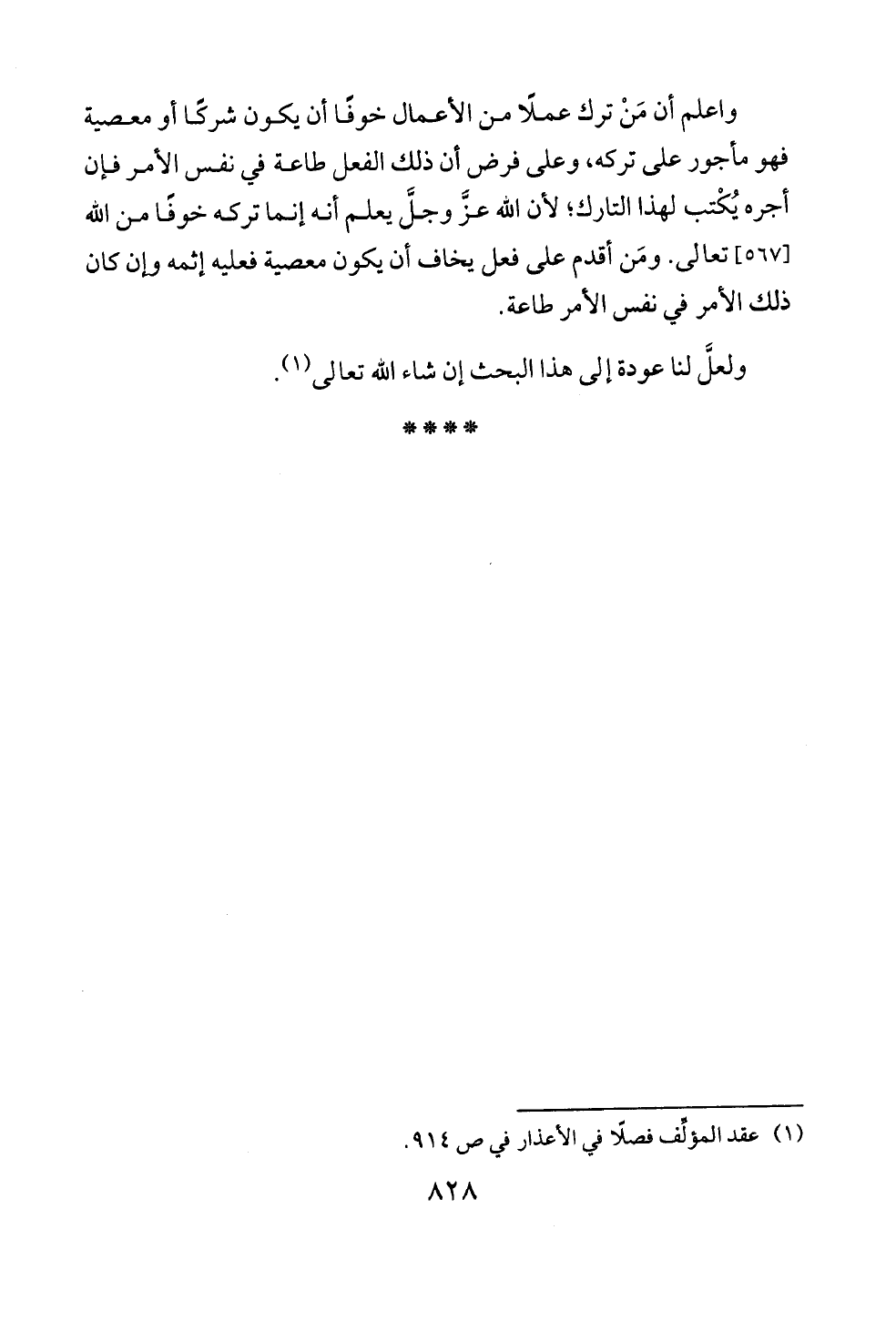 واعلم أن مَنْ ترك عملًا من الأعمال خوفًا أن يكون شركًا أو معصية فهو مأجور على تركه، وعلى فرض أن ذلك الفعل طاعة في نفس الأمر فإن أجره يُكْتب لهذا التارك؛ لأن الله عزَّ وجلَّ يعلم أنه إنما تركه خوفًا من الله [٥٦٧] تعالى. ومَن أقدم على فعل يخاف أن يكون معصية فعليه إثمه وإن كان ذلك الأمر في نفس الأمر طاعة.