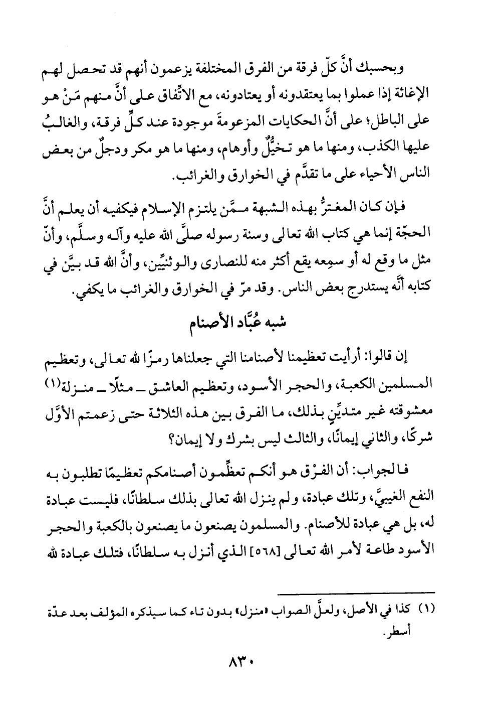 فالجواب: أن الفرْق هو أنكم تعظِّمون أصنامكم تعظيمًا تطلبون به النفع الغيبيَّ، وتلك عبادة، ولم ينزل الله تعالى بذلك سلطانًا، فليست عبادة له، بل هي عبادة للأصنام. والمسلمون يصنعون ما يصنعون بالكعبة والحجر الأسود طاعة لأمر الله تعالى [٥٦٨] الذي أنزل به سلطانًا، فتلك عبادة لله