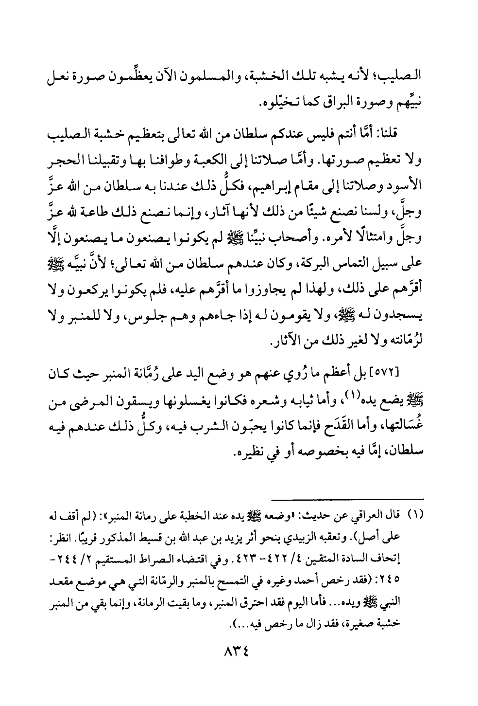قلنا: أمَّا أنتم فليس عندكم سلطان من الله تعالى بتعظيم خشبة الصليب ولا تعظيم صورتها. وأمَّا صلاتنا إلى الكعبة وطوافنا بها وتقبيلنا الحجر الأسود وصلاتنا إلى مقام إبراهيم, فكلُّ ذلك عندنا به سلطان من الله عزَّ وجلَّ، ولسنا نصنع شيئًا من ذلك لأنها آثار، وإنما نصنع ذلك طاعة لله عزَّ وجلَّ وامتثالًا لأمره. وأصحاب نبيِّنا - صلى الله عليه وسلم - لم يكونوا يصنعون ما يصنعون إلَّا على سبيل التماس البركة، وكان عندهم سلطان من الله تعالى؛ لأنَّ نبيَّه - صلى الله عليه وسلم - أقرَّهم على ذلك، ولهذا لم يجاوزوا ما أقرَّهم عليه، فلم يكونوا يركعون ولا يسجدون له - صلى الله عليه وسلم -، ولا يقومون له إذا جاءهم وهم جلوس، ولا للمنبر ولا لرُمّانته ولا لغير ذلك من الآثار.