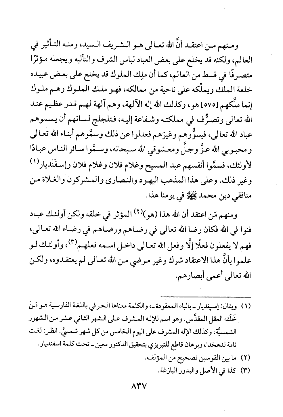 ومنهم من اعتقد أنَّ الله تعالى هو الشريف السيد، ومنه التأثير في العالم، ولكنه قد يخلع على بعض العباد لباس الشرف والتأليه ويجعله مؤثرًا متصرفًا في قسط من العالم، كما أن ملِك الملوك قد يخلع على بعض عبيده خلعة الملك ويملِّكه على ناحية من ممالكه، فهو ملك الملوك وهم ملوك إنما ملَّكهم [٥٧٥] هو, وكذلك الله إله الآلهة، وهم آلهة لهم قدر عظيم عند الله تعالى وتصرُّف في مملكته وشفاعة إليه, فتلجلج لسانهم أن يسموهم عباد الله تعالى، فيسوُّوهم وغيرَهم فعدلوا عن ذلك وسمَّوهم أبناء الله تعالى ومحبوبي الله عزَّ وجلَّ ومعشوقي الله سبحانه، وسمَّوا سائر الناس عبادًا لأولئك، فسمَّوا أنفسهم عبد المسيح وغلام فلان وغلام فلان وإسفَنْديار (¬١) وغير ذلك. وعلى هذا المذهب اليهود والنصارى والمشركون والغلاة من منافقي دين محمد - صلى الله عليه وسلم - في يومنا هذا.