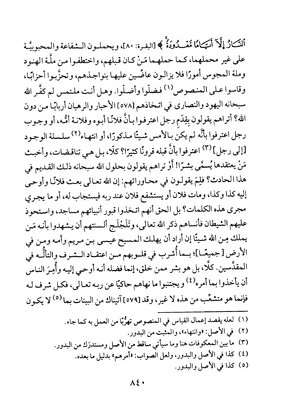 النَّارُ إِلَّا أَيَّامًا مَعْدُودَةً} [البقرة: ٨٠]، ويحملون الشفاعة والمحبوبيَّة على غير محملهما، كما حملهما مَنْ كان قبلهم، واختطفوا من ملَّة الهنود وملة المجوس أمورًا فلا يزالون عاضِّين عليها بنواجذهم، وتحزَّبوا أحزابًا، وقاسوا على المنصوص (¬١) فضلّوا وأضلّوا. وهل أنت ملتمس لم كفَّر الله سبحانه اليهود والنصارى في اتخاذهم [٥٧٨] الأحبار والرهبان أربابًا من دون الله؟ أتراهم يقولون بِقِدَمِ رجل اعترفوا بأنَّ فلانًا أبوه وفلانة أمُّه، أو وجوب رجل اعترفوا بأنَّه لم يكن بالأمس شيئًا مذكورًا، أو انتهاء (¬٢) سلسلة الوجود [إلى رجل] (¬٣) اعترفوا بأنَّ قبله قرونًا كثيرًا؟ كلّا، بل هي تناقضات، وأخبث مَنْ يعتقدها يُسمَّى بشرًا! أَوْ تراهم يقولون بحلول الله سبحانه ذلك القديم في هذا الحادث؟ فلِمَ يقولون في محاوراتهم: إن الله تعالى بعث فلانًا وأوحى إليه كذا وكذا، ومات فلان أو يستشفع فلان عند ربه فيستجاب له، أو ما يجري مجرى هذه الكلمات؟ بل الحق أنهم اتخذوا قبور أنبيائهم مساجد، واستحوذ عليهم الشيطان فأنساهم ذكر الله تعالى، وتَلَجْلَج ألسنتهم أن يشهدوا بأنه مَن يملك مِن الله شيئًا إن أراد أن يهلك المسيح عيسى بن مريم وأمه ومن في الأرض [جميعًا]؛ بما أُشرب في قلوبهم من اعتقاد الشرف والتألُّه في المقدَّسين. كلَّا، بل هو بشر ممن خلق، إنما فضله أنه أوحي إليه وأُمِرَ الناس أن يأخذوا بما أمره (¬٤)