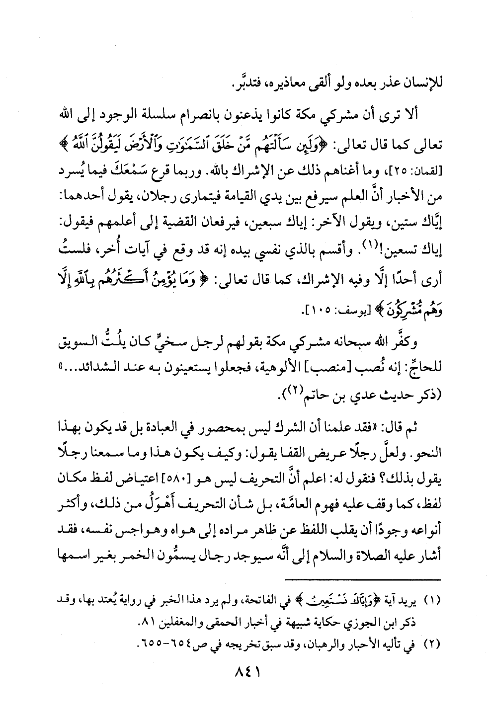 وكفَّر الله سبحانه مشركي مكة بقولهم لرجل سخيٍّ كان يلُتُّ السويق للحاجِّ: إنه نُصب [منصب] الألوهية، فجعلوا يستعينون به عند الشدائد ... » (ذكر حديث عدي بن حاتم (¬٢)).
