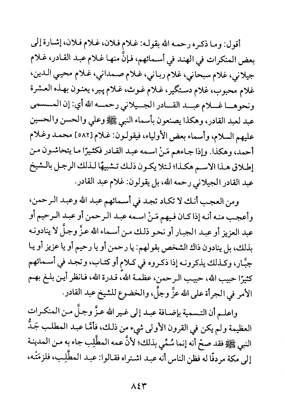 أقول: وما ذكره رحمه الله بقوله: غلام فلان، غلام فلان، إشارة إلى بعض المنكرات في الهند في أسمائهم، فإنَّ منها غلام عبد القادر، غلام جيلاني، غلام سبحاني، غلام رباني، غلام صمداني، غلام محيي الدين، غلام محبوب، غلام دستكير، غلام غوث، غلام بير، يعنون بهذه العشرة ونحوها غلام عبد القادر الجيلاني رحمه الله أي: إن المسمى عبد لعبد القادر، وهكذا يصنعون بأسماء النبي - صلى الله عليه وسلم - وعلي والحسن والحسين عليهم السلام، وأسماء بعض الأولياء، فيقولون: غلام [٥٨٢] محمد وغلام أحمد، وهكذا. وإذا جاءهم مَنْ اسمه عبد القادر فكثيرًا ما يتحاشون من إطلاق هذا الاسم هكذا؛ لئلا يكون ذلك تشبيهًا لذلك الرجل بالشيخ عبد القادر الجيلاني رحمه الله، بل يقولون: غلام عبد القادر.
