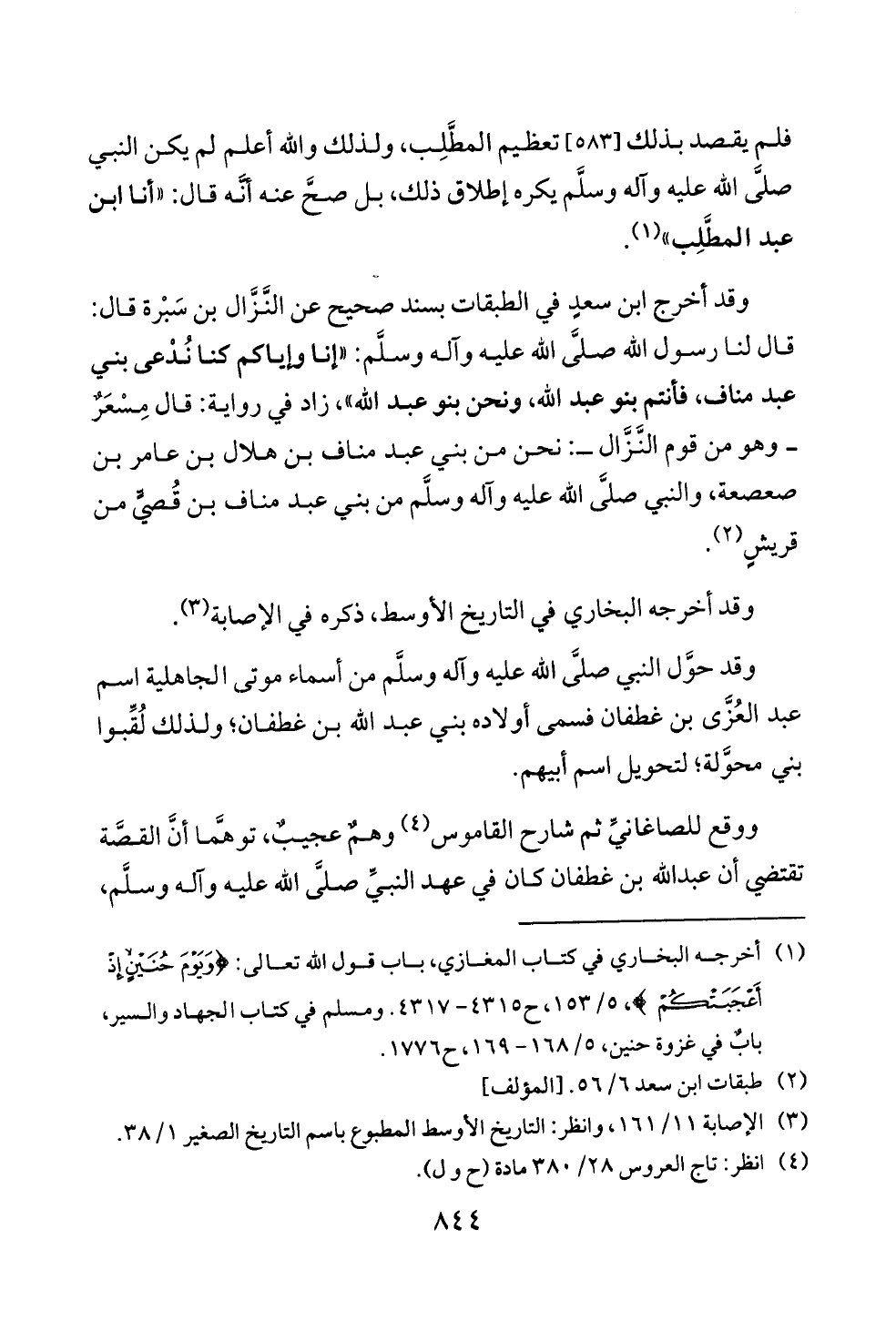 وقد أخرج ابن سعدٍ في الطبقات بسند صحيح عن النَّزَّال بن سَبْرة قال: قال لنا رسول الله صلَّى الله عليه وآله وسلَّم: «إنا وإياكم كنا نُدْعى بني عبد مناف، فأنتم بنو عبد الله، ونحن بنو عبد الله»، زاد في رواية: قال مِسْعَرٌ ــ وهو من قوم النَّزَّال ــ: نحن من بني عبد مناف بن هلال بن عامر بن صعصعة، والنبي صلَّى الله عليه وآله وسلَّم من بني عبد مناف بن قُصيٍّ من قريشٍ (¬٢).