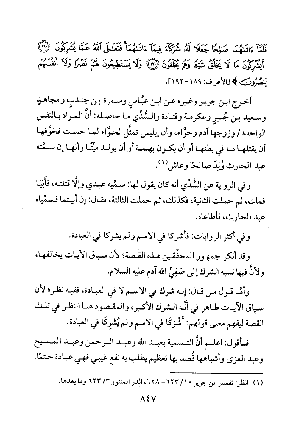 فَلَمَّا آتَاهُمَا صَالِحًا جَعَلَا لَهُ شُرَكَاءَ فِيمَا آتَاهُمَا فَتَعَالَى اللَّهُ عَمَّا يُشْرِكُونَ (١٩٠) أَيُشْرِكُونَ مَا لَا يَخْلُقُ شَيْئًا وَهُمْ يُخْلَقُونَ (١٩١) وَلَا يَسْتَطِيعُونَ لَهُمْ نَصْرًا وَلَا أَنْفُسَهُمْ يَنْصُرُونَ} [الأعراف: ١٨٩ - ١٩٢].