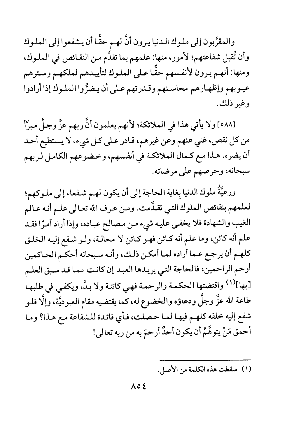 [٥٨٨] ولا يأتي هذا في الملائكة؛ لأنهم يعلمون أنَّ ربهم عزَّ وجلَّ مبرَّأ من كل نقص، غني عنهم وعن غيرهم، قادر على كل شيء، لا يستطيع أحد أن يضره. هذا مع كمال الملائكة في أنفسهم، وخضوعهم الكامل لربهم سبحانه، وحرصهم على مرضاته.