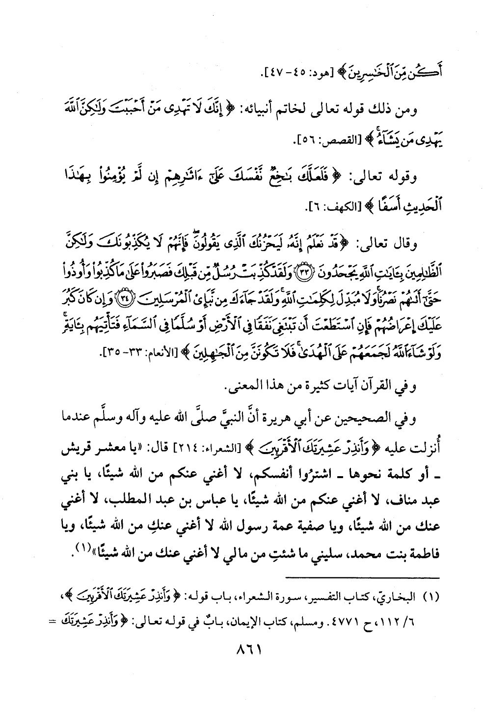 وفي الصحيحين عن أبي هريرة أنَّ النبيَّ صلَّى الله عليه وآله وسلَّم عندما أُنزلت عليه {وَأَنْذِرْ عَشِيرَتَكَ الْأَقْرَبِينَ} [الشعراء: ٢١٤] قال: «يا معشر قريش ــ أو كلمة نحوها ــ اشترُوا أنفسكم، لا أغني عنكم من الله شيئًا، يا بني عبد مناف، لا أغني عنكم من الله شيئًا، يا عباس بن عبد المطلب، لا أغني عنك من الله شيئًا، ويا صفية عمة رسول الله لا أغني عنكِ من الله شيئًا، ويا فاطمة بنت محمد، سليني ما شئتِ من مالي لا أغني عنك من الله شيئًا» (¬١).