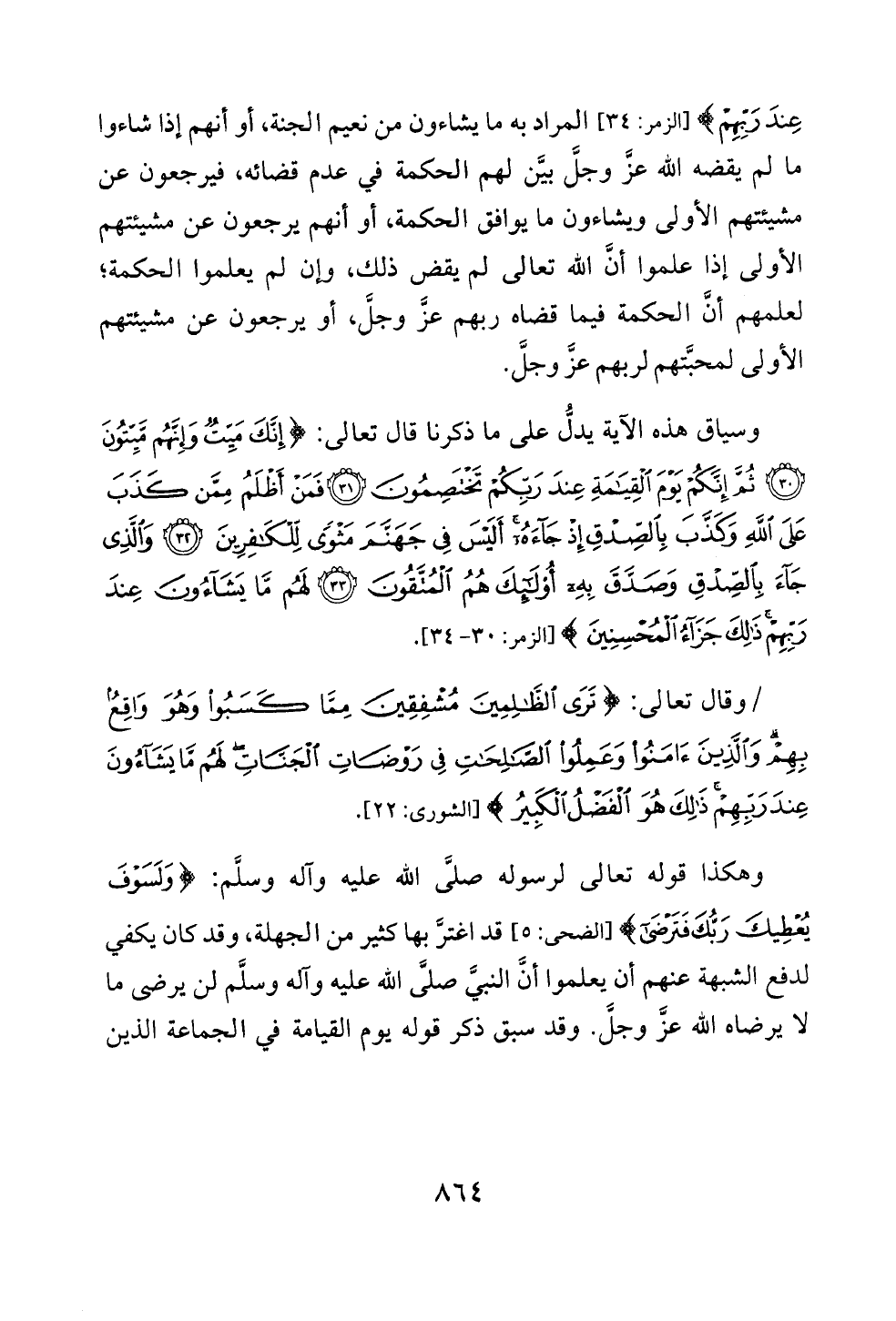عِنْدَ رَبِّهِمْ} [الزمر: ٣٤] المراد به ما يشاءون من نعيم الجنة، أو أنهم إذا شاءوا ما لم يقضه الله عزَّ وجلَّ بيَّن لهم الحكمة في عدم قضائه، فيرجعون عن مشيئتهم الأولى ويشاءون ما يوافق الحكمة، أو أنهم يرجعون عن مشيئتهم الأولى إذا علموا أنَّ الله تعالى لم يقض ذلك، وإن لم يعلموا الحكمة؛ لعلمهم أنَّ الحكمة فيما قضاه ربهم عزَّ وجلَّ، أو يرجعون عن مشيئتهم الأولى لمحبَّتهم لربهم عزَّ وجلَّ.