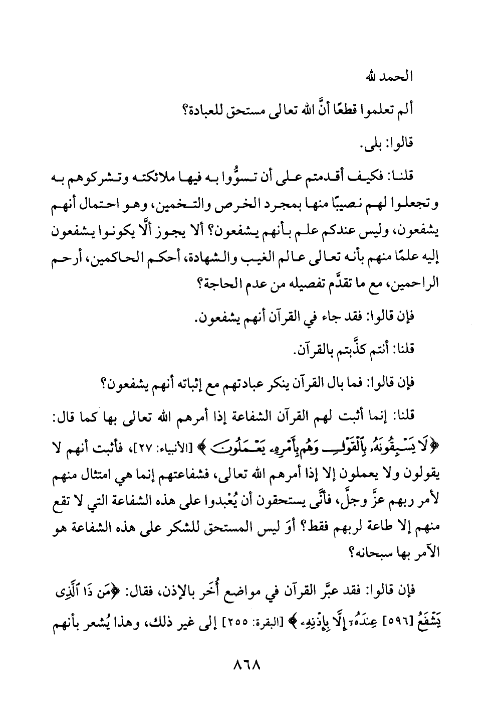 قلنا: إنما أثبت لهم القرآن الشفاعة إذا أمرهم الله تعالى بها كما قال: {لَا يَسْبِقُونَهُ بِالْقَوْلِ وَهُمْ بِأَمْرِهِ يَعْمَلُونَ} [الأنبياء: ٢٧]، فأثبت أنهم لا يقولون ولا يعملون إلا إذا أمرهم الله تعالى، فشفاعتهم إنما هي امتثال منهم لأمر ربهم عزَّ وجلَّ، فأنَّى يستحقون أن يُعْبدوا على هذه الشفاعة التي لا تقع منهم إلا طاعة لربهم فقط؟ أوَ ليس المستحق للشكر على هذه الشفاعة هو الآمر بها سبحانه؟
