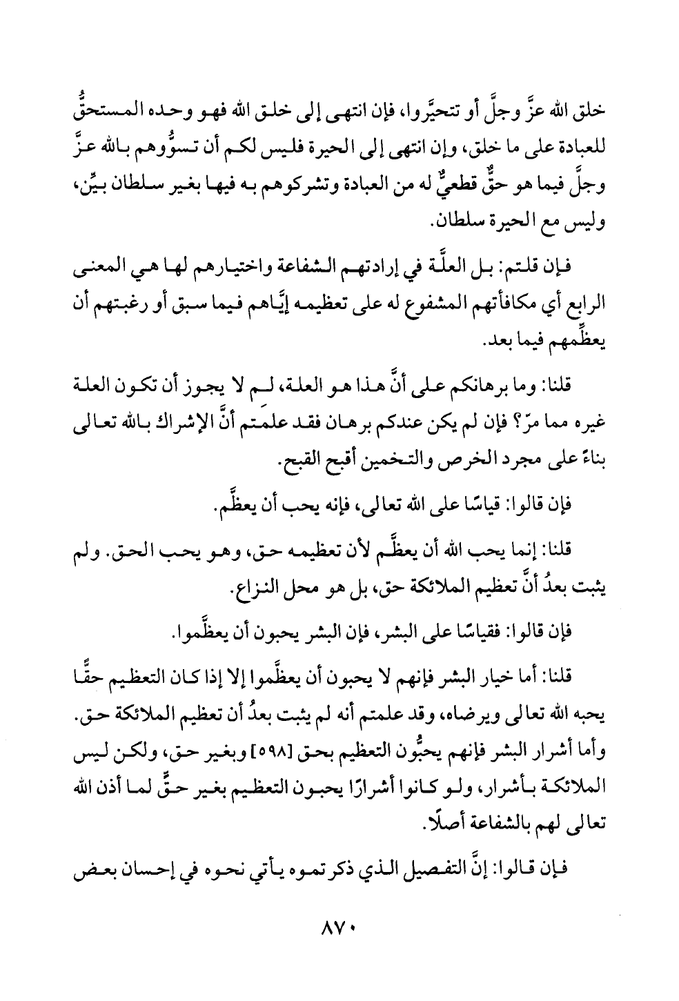 قلنا: أما خيار البشر فإنهم لا يحبون أن يعظَّموا إلا إذا كان التعظيم حقًّا يحبه الله تعالى ويرضاه، وقد علمتم أنه لم يثبت بعدُ أن تعظيم الملائكة حق. وأما أشرار البشر فإنهم يحبُّون التعظيم بحق [٥٩٨] وبغير حق، ولكن ليس الملائكة بأشرار، ولو كانوا أشرارًا يحبون التعظيم بغير حقٍّ لما أذن الله تعالى لهم بالشفاعة أصلًا.