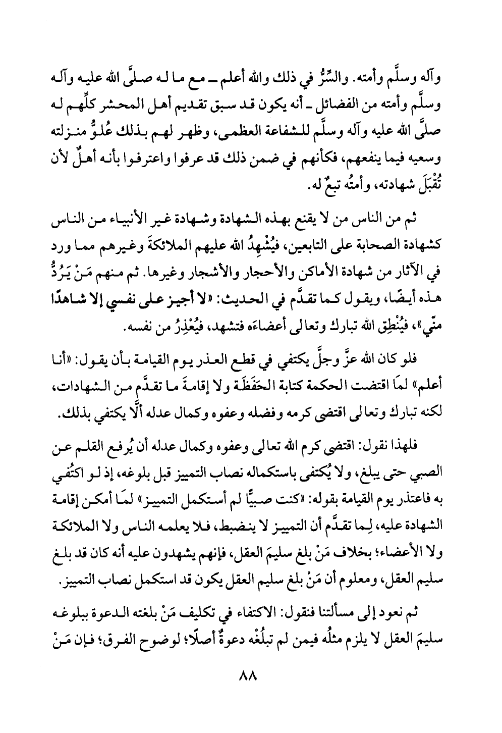 وآله وسلَّم وأمته. والسِّرُّ في ذلك والله أعلم ــ مع ما له صلَّى الله عليه وآله وسلَّم وأمته من الفضائل ــ أنه يكون قد سبق تقديم أهل المحشر كلِّهم له صلَّى الله عليه وآله وسلَّم للشفاعة العظمى، وظهر لهم بذلك عُلوُّ منزلته وسعيه فيما ينفعهم، فكأنهم في ضمن ذلك قد عرفوا واعترفوا بأنه أهلٌ لأن تُقْبَلَ شهادته، وأمتُه تبعٌ له.