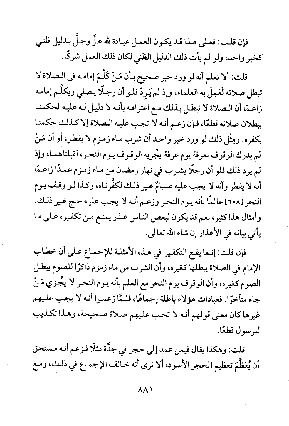 قلت: ألا تعلم أنه لو ورد خبر صحيح بأن مَنْ كَلَّمَ إمامه في الصلاة لا تبطل صلاته لَعَمِلَ به العلماء، وإذ لم يَرِدْ فلو أن رجلًا يصلي ويكلِّم إمامه زاعمًا أن الصلاة لا تبطل بذلك مع اعترافه بأنه لا دليل له عليه لحكمنا ببطلان صلاته قطعًا، فإن زعم أنه لا تجب عليه الصلاة إلا كذلك حكمنا بكفره. ومِثْل ذلك لو ورد خبر واحد أن شرب ماء زمزم لا يفطر, أو أن مَنْ لم يدرك الوقوف بعرفة يوم عرفة يُجزيه الوقوف يوم النحر, لقبلناهما، وإذ لم يرد ذلك فلو أن رجلًا يشرب في نهار رمضان من ماء زمزم عمدًا زاعمًا أنه لا يفطر وأنه لا يجب عليه صيامٌ غير ذلك لكفَّرناه, وكذا لو وقف يوم النحر [٦٠٨] عالمًا بأنه يوم النحر وزعم أنه لا يجب عليه حج غير ذلك. وأمثال هذا كثير، نعم قد يكون لبعض الناس عذر يمنع من تكفيره على ما يأتي بيانه في الأعذار إن شاء الله تعالى.