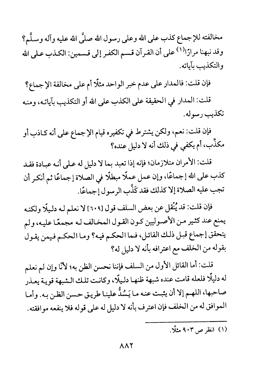 فإن قلت: نعم، ولكن يشترط في تكفيره قيام الإجماع على أنه كاذب أو مكذِّب, أم يكفي في ذلك أنه لا دليل عنده؟