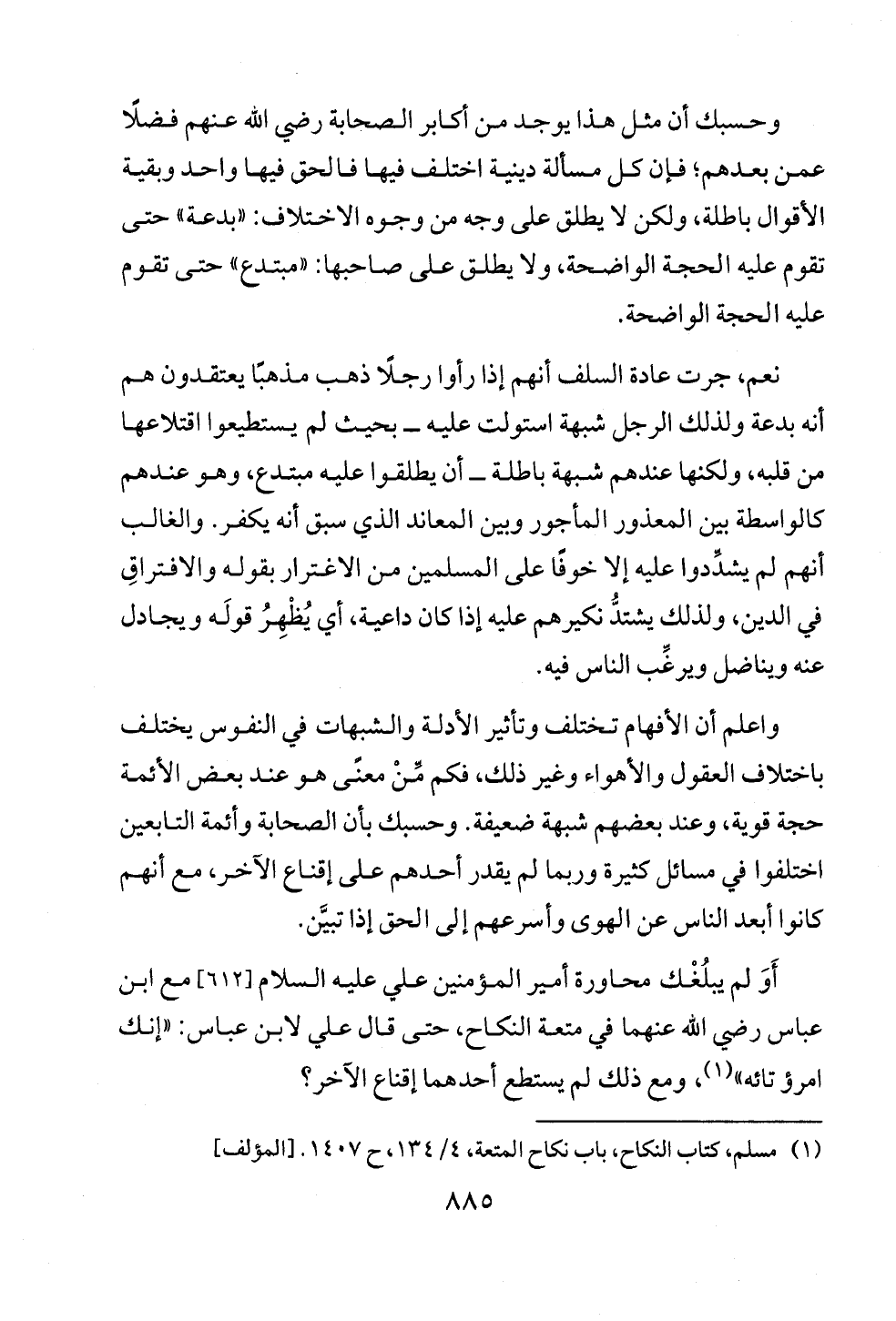 أَوَ لم يبلُغْك محاورة أمير المؤمنين علي عليه السلام [٦١٢] مع ابن عباس رضي الله عنهما في متعة النكاح، حتى قال علي لابن عباس: «إنك امرؤ تائه» (¬١)، ومع ذلك لم يستطع أحدهما إقناع الآخر؟