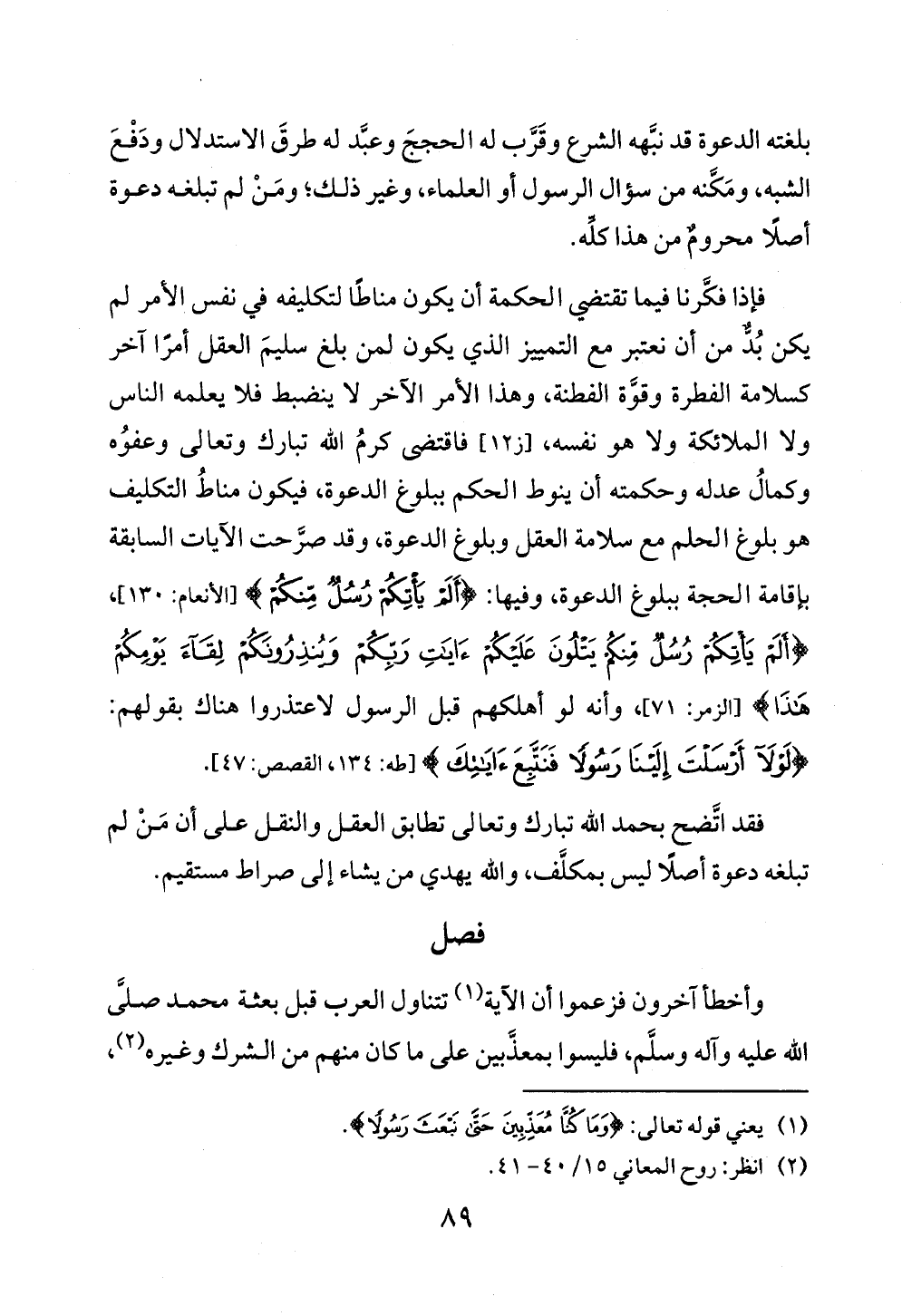 فإذا فكَّرنا فيما تقتضي الحكمة أن يكون مناطًا لتكليفه في نفس الأمر لم يكن بُدٌّ من أن نعتبر مع التمييز الذي يكون لمن بلغ سليمَ العقل أمرًا آخر كسلامة الفطرة وقوَّة الفطنة، وهذا الأمر الآخر لا ينضبط فلا يعلمه الناس ولا الملائكة ولا هو نفسه، [ز ١٢] فاقتضى كرمُ الله تبارك وتعالى وعفوُه وكمالُ عدله وحكمته أن ينوط الحكم ببلوغ الدعوة، فيكون مناطُ التكليف هو بلوغ الحلم مع سلامة العقل وبلوغ الدعوة، وقد صرَّحت الآيات السابقة بإقامة الحجة ببلوغ الدعوة، وفيها: {أَلَمْ يَأْتِكُمْ رُسُلٌ مِنْكُمْ} [الأنعام: ١٣٠]، {أَلَمْ يَأْتِكُمْ رُسُلٌ مِنْكُمْ يَتْلُونَ عَلَيْكُمْ آيَاتِ رَبِّكُمْ وَيُنْذِرُونَكُمْ لِقَاءَ يَوْمِكُمْ هَذَا} [الزمر: ٧١]، وأنه لو أهلكهم قبل الرسول لاعتذروا هناك بقولهم: {لَوْلَا أَرْسَلْتَ إِلَيْنَا رَسُولًا فَنَتَّبِعَ آيَاتِكَ} [طه: ١٣٤، القصص: ٤٧].