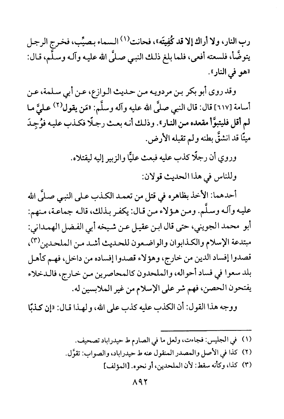 أحدهما: الأخذ بظاهره في قتل من تعمد الكذب على النبي صلَّى الله عليه وآله وسلَّم. ومن هؤلاء من قال: يكفر بذلك، قاله جماعة، منهم: أبو محمد الجويني، حتى قال ابن عقيل عن شيخه أبي الفضل الهمداني: مبتدعة الإسلام والكذابوان والواضعون للحديث أشد من الملحدين (¬٣)، قصدوا إفساد الدين من خارج، وهؤلاء قصدوا إفساده من داخل، فهم كأهل بلد سعوا في فساد أحواله، والملحدون كالمحاصرين من خارج، فالدخلاء يفتحون الحصن، فهم شر على الإسلام من غير الملابسين له.