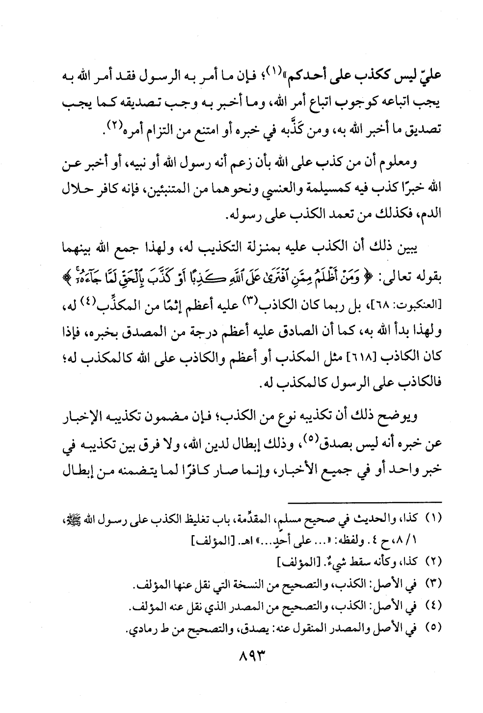 يبين ذلك أن الكذب عليه بمنزلة التكذيب له، ولهذا جمع الله بينهما بقوله تعالى: {وَمَنْ أَظْلَمُ مِمَّنِ افْتَرَى عَلَى اللَّهِ كَذِبًا أَوْ كَذَّبَ بِالْحَقِّ لَمَّا جَاءَهُ} [العنكبوت: ٦٨]، بل ربما كان الكاذب (¬٣) عليه أعظم إثمًا من المكذِّب (¬٤) له، ولهذا بدأ الله به، كما أن الصادق عليه أعظم درجة من المصدق بخبره، فإذا كان الكاذب [٦١٨] مثل المكذب أو أعظم والكاذب على الله كالمكذب له؛ فالكاذب على الرسول كالمكذب له.