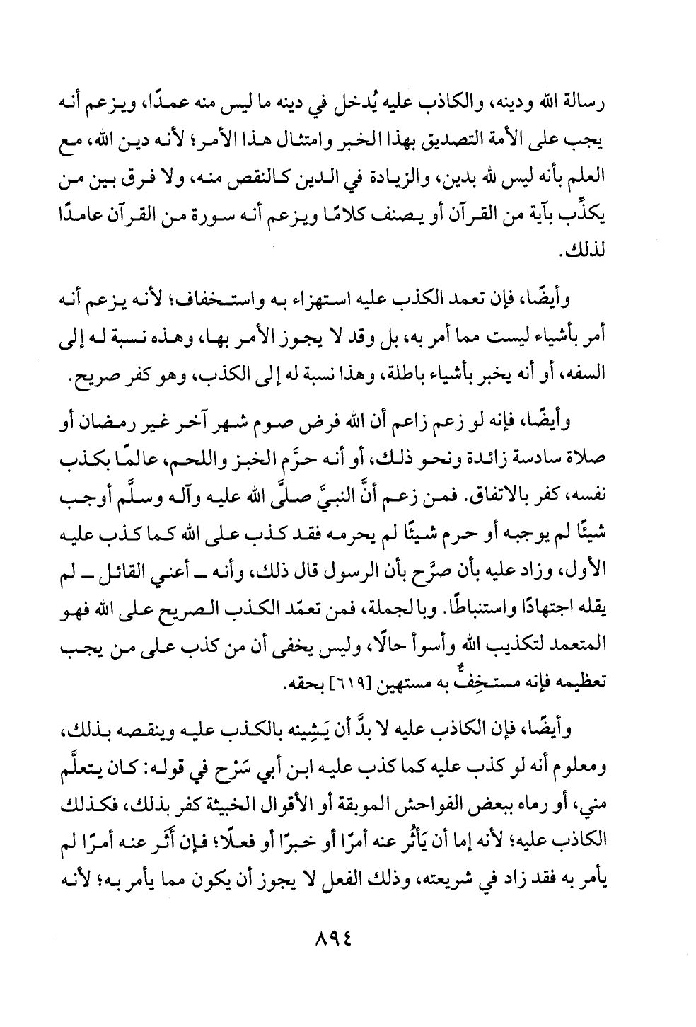وأيضًا، فإنه لو زعم زاعم أن الله فرض صوم شهر آخر غير رمضان أو صلاة سادسة زائدة ونحو ذلك, أو أنه حرَّم الخبز واللحم, عالمًا بكذب نفسه, كفر بالاتفاق. فمن زعم أنَّ النبيَّ صلَّى الله عليه وآله وسلَّم أوجب شيئًا لم يوجبه أو حرم شيئًا لم يحرمه فقد كذب على الله كما كذب عليه الأول, وزاد عليه بأن صرَّح بأن الرسول قال ذلك، وأنه ــ أعني القائل ــ لم يقله اجتهادًا واستنباطًا. وبالجملة، فمن تعمّد الكذب الصريح على الله فهو المتعمد لتكذيب الله وأسوأ حالًا، وليس يخفى أن من كذب على من يجب تعظيمه فإنه مستخِفٌّ به مستهين [٦١٩] بحقه.