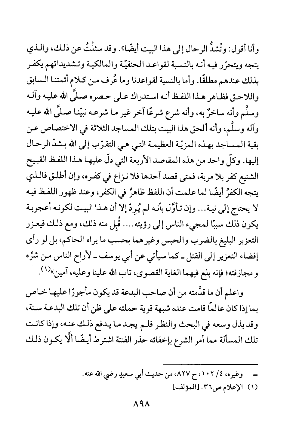 وأنا أقول: وتُشدُّ الرحال إلى هذا البيت أيضًا». وقد سئلْتُ عن ذلك، والذي يتجه ويتحرّر فيه أنه بالنسبة لقواعد الحنفيّة والمالكية وتشديداتهم يكفر بذلك عندهم مطلقًا. وأما بالنسبة لقواعدنا وما عُرف من كلام أئمتنا السابق واللاحق فظاهر هذا اللفظ أنه استدراك على حصره صلَّى الله عليه وآله وسلَّم وأنه ساخرٌ به، وأنه شرع شرعًا آخر غير ما شرعه نبيّنا صلَّى الله عليه وآله وسلَّم، وأنه ألحق هذا البيت بتلك المساجد الثلاثة في الاختصاص عن بقية المساجد بهذه المزيّة العظيمة التي هي التقرّب إلى الله بشدّ الرحال إليها. وكلّ واحد من هذه المقاصد الأربعة التي دلّ عليها هذا اللفظ القبيح الشنيع كفر بلا مرية، فمتى قصد أحدها فلا نزاع في كفره، وإن أطلق فالذي يتجه الكفرُ أيضًا لما علمت أن اللفظ ظاهرٌ في الكفر، وعند ظهور اللفظ فيه لا يحتاج إلى نية ... وإن تأوَّل بأنه لم يُرِدْ إلا أن هذا البيت لكونه أعجوبة يكون ذلك سببًا لمجيء الناس إلى رؤيته .... قُبِل منه ذلك، ومع ذلك فيعزر التعزير البليغ بالضرب والحبس وغيرهما بحسب ما يراه الحاكم، بل لو رأى إفضاء التعزير إلى القتل ــ كما سيأتي عن أبي يوسف ــ لأراح الناس من شرِّه ومجازفته؛ فإنه بلغ فيهما الغاية القصوى، تاب الله علينا وعليه، آمين» (¬١).