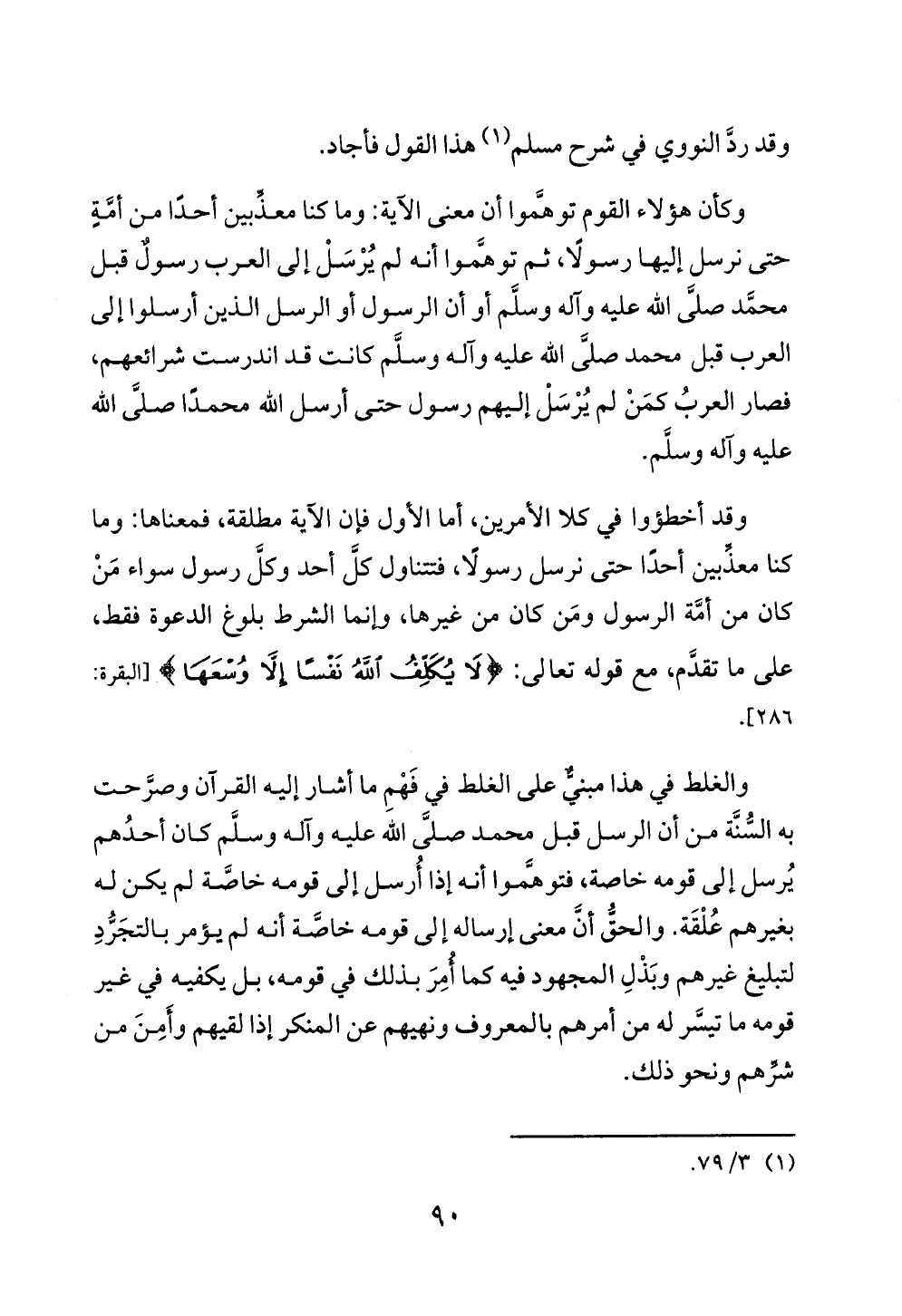 والغلط في هذا مبنيٌّ على الغلط في فَهْمِ ما أشار إليه القرآن وصرَّحت به السُّنَّة من أن الرسل قبل محمد صلَّى الله عليه وآله وسلَّم كان أحدُهم يُرسل إلى قومه خاصة، فتوهَّموا أنه إذا أُرسل إلى قومه خاصَّة لم يكن له بغيرهم عُلْقَة. والحقُّ أنَّ معنى إرساله إلى قومه خاصَّة أنه لم يؤمر بالتجَرُّدِ لتبليغ غيرهم وبَذْلِ المجهود فيه كما أُمِرَ بذلك في قومه، بل يكفيه في غير قومه ما تيسَّر له من أمرهم بالمعروف ونهيهم عن المنكر إذا لقيهم وأَمِنَ من شرِّهم ونحو ذلك.