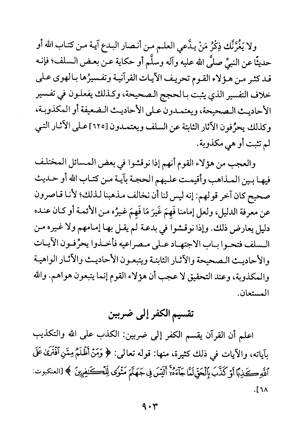 ولا يَغُرَّنَّك ذِكْرُ مَنْ يدَّعي العلم من أنصار البدع آية من كتاب الله أو حديثًا عن النبيِّ صلَّى الله عليه وآله وسلَّم أو حكاية عن بعض السلف؛ فإنه قد كثر من هؤلاء القوم تحريف الآيات القرآنية وتفسيرُها بالهوى على خلاف التفسير الذي يثبت بالحجج الصحيحة، وكذلك يفعلون في تفسير الأحاديث الصحيحة, ويعتمدون على الأحاديث الضعيفة أو المكذوبة، وكذلك يحرِّفون الآثار الثابتة عن السلف ويعتمدون [٦٢٥] على الآثار التي لم تثبت أو هي مكذوبة.