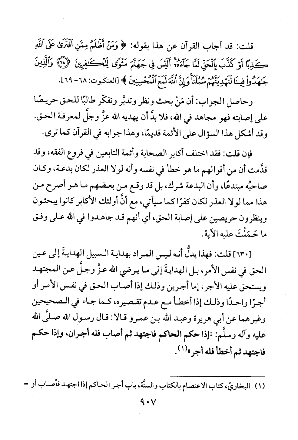 [٦٣٠] قلت: فهذا يدلُّ أنه ليس المراد بهداية السبيل الهدايةَ إلى عين الحق في نفس الأمر، بل الهدايةَ إلى ما يرضي الله عزَّ وجلَّ عن المجتهد ويستحق عليه الأجر، إما أجرين وذلك إذا أصاب الحق في نفس الأمر أو أجرًا واحدًا وذلك إذا أخطأ مع عدم تقصيره, كما جاء في الصحيحين وغيرهما عن أبي هريرة وعبد الله بن عمرو قالا: قال رسول الله صلَّى الله عليه وآله وسلَّم: «إذا حكم الحاكم فاجتهد ثم أصاب فله أجران، وإذا حكم فاجتهد ثم أخطأ فله أجر» (¬١).