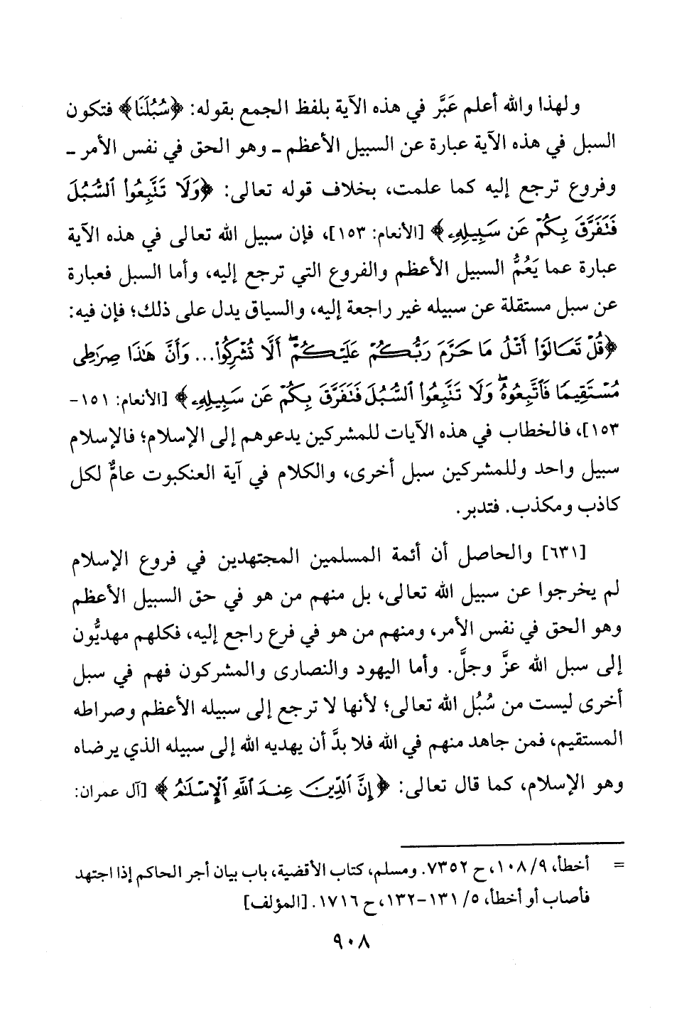 [٦٣١] والحاصل أن أئمة المسلمين المجتهدين في فروع الإسلام لم يخرجوا عن سبيل الله تعالى، بل منهم من هو في حق السبيل الأعظم وهو الحق في نفس الأمر، ومنهم من هو في فرع راجع إليه، فكلهم مهديُّون إلى سبل الله عزَّ وجلَّ. وأما اليهود والنصارى والمشركون فهم في سبل أخرى ليست من سُبُل الله تعالى؛ لأنها لا ترجع إلى سبيله الأعظم وصراطه المستقيم، فمن جاهد منهم في الله فلا بدَّ أن يهديه الله إلى سبيله الذي يرضاه وهو الإسلام، كما قال تعالى: {إِنَّ الدِّينَ عِنْدَ اللَّهِ الْإِسْلَامُ} [آل عمران: