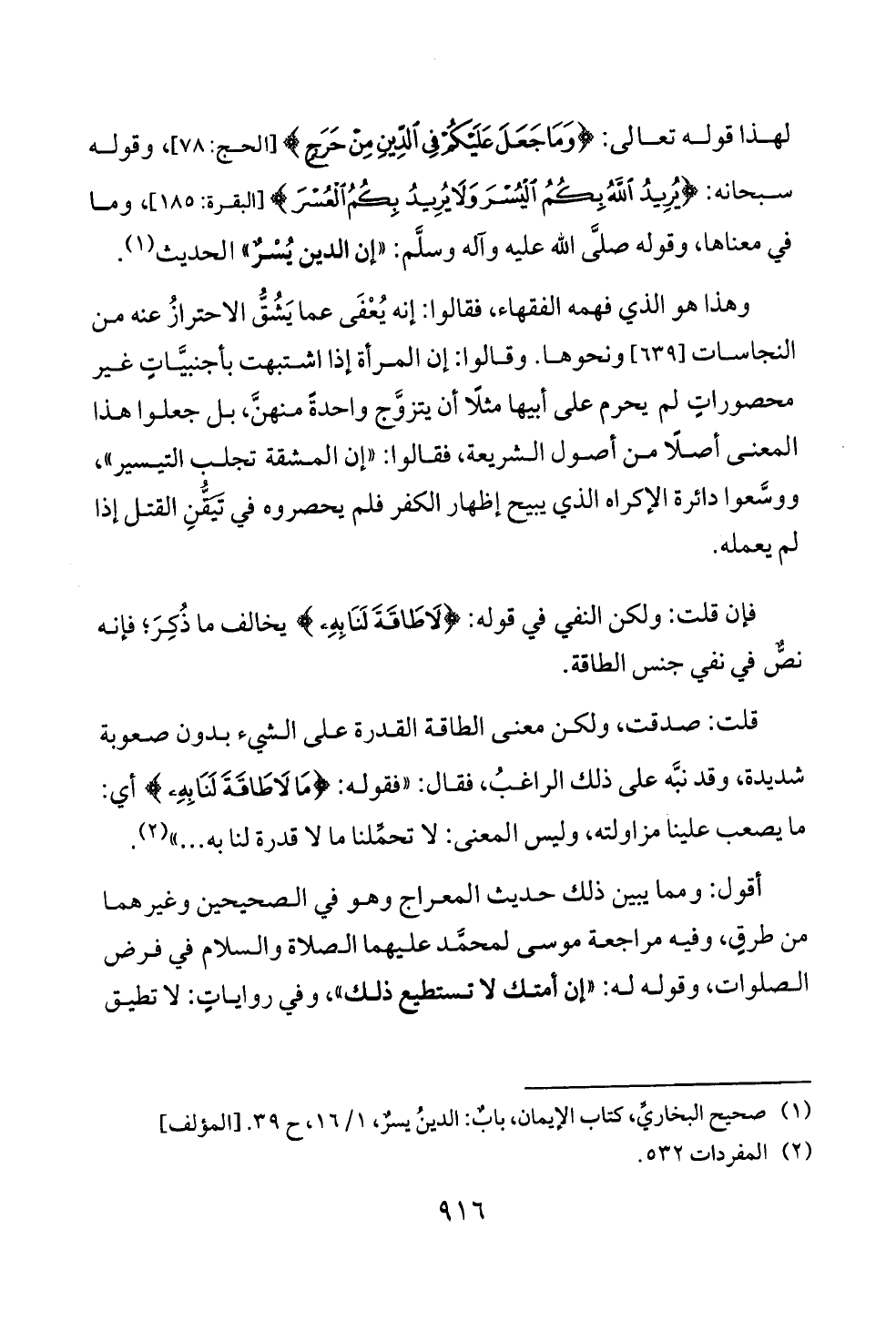 لهذا قوله تعالى: {وَمَا جَعَلَ عَلَيْكُمْ فِي الدِّينِ مِنْ حَرَجٍ} [الحج: ٧٨] , وقوله سبحانه: {يُرِيدُ اللَّهُ بِكُمُ الْيُسْرَ وَلَا يُرِيدُ بِكُمُ الْعُسْرَ} [البقرة: ١٨٥] , وما في معناها, وقوله صلَّى الله عليه وآله وسلَّم: «إن الدين يُسْرٌ» الحديث (¬١).