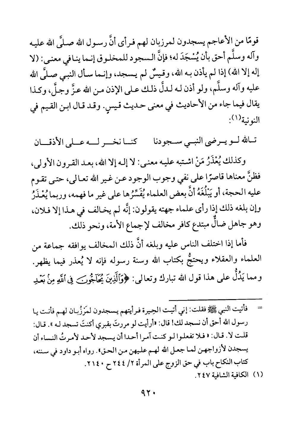 قومًا من الأعاجم يسجدون لمرزبان لهم فرأى أنَّ رسول الله صلَّى الله عليه وآله وسلَّم أحق بأن يُسْجَدَ له؛ فإنَّ السجود للمخلوق إنما ينافي معنى: (لا إله إلا الله) إذا لم يأذن به الله، وقيسٌ لم يسجد، وإنما سأل النبي صلَّى الله عليه وآله وسلَّم، ولو أذن له لدلَّ ذلك على الإذن من الله عزَّ وجلَّ، وكذا يقال فيما جاء من الأحاديث في معنى حديث قيسٍ. وقد قال ابن القيم في النونية (¬١):