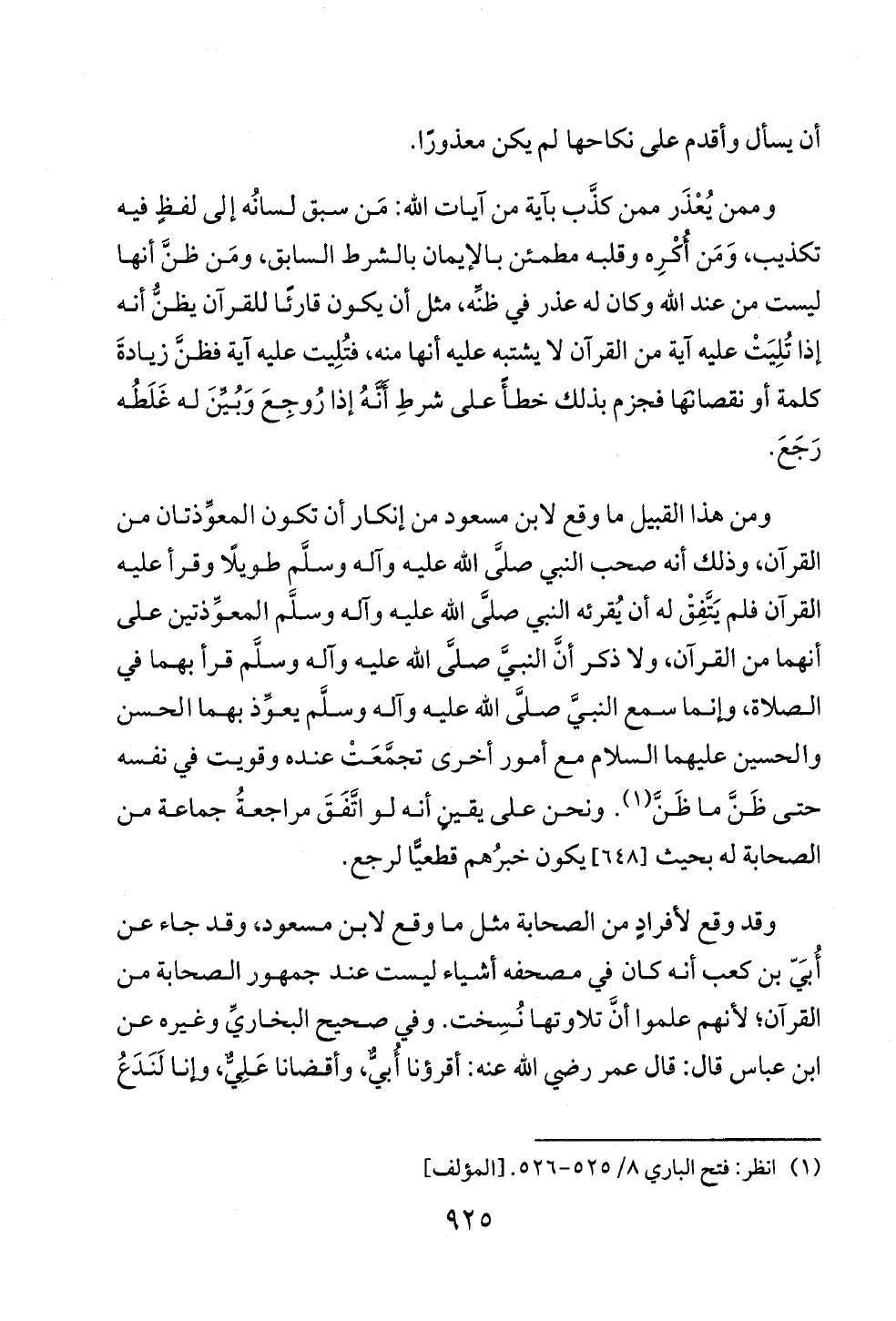ومن هذا القبيل ما وقع لابن مسعود من إنكار أن تكون المعوِّذتان من القرآن، وذلك أنه صحب النبي صلَّى الله عليه وآله وسلَّم طويلًا وقرأ عليه القرآن فلم يَتَّفِقْ له أن يُقرئه النبي صلَّى الله عليه وآله وسلَّم المعوِّذتين على أنهما من القرآن، ولا ذكر أنَّ النبيَّ صلَّى الله عليه وآله وسلَّم قرأ بهما في الصلاة، وإنما سمع النبيَّ صلَّى الله عليه وآله وسلَّم يعوِّذ بهما الحسن والحسين عليهما السلام مع أمور أخرى تجمَّعَتْ عنده وقويت في نفسه حتى ظَنَّ ما ظَنَّ (¬١). ونحن على يقينٍ أنه لو اتَّفَقَ مراجعةُ جماعة من الصحابة له بحيث [٦٤٨] يكون خبرُهم قطعيًّا لرجع.