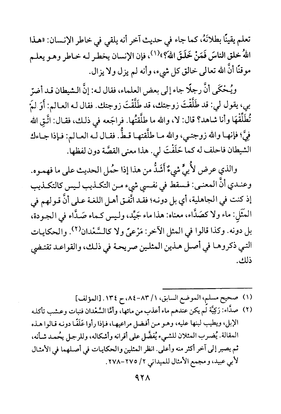 ويُحْكَى أنَّ رجلًا جاء إلى بعض العلماء، فقال له: إنَّ الشيطان قد أضرّ بي، يقول لي: قد طَلَّقْتَ زوجتك، قد طَلَّقْتَ زوجتك. فقال له العالم: أَوَ لَمْ تُطَلِّقْهَا وأنا شاهد؟ قال: لا، والله ما طلَّقتُها. فراجَعه في ذلك، فقال: اتَّقِ الله فِيَّ؛ فإنها والله زوجتي، والله ما طلَّقتها قطُّ. فقال له العالم: فإذا جاءك الشيطان فاحلف له كما حَلَفْتَ لي. هذا معنى القصَّة دون لفظها.