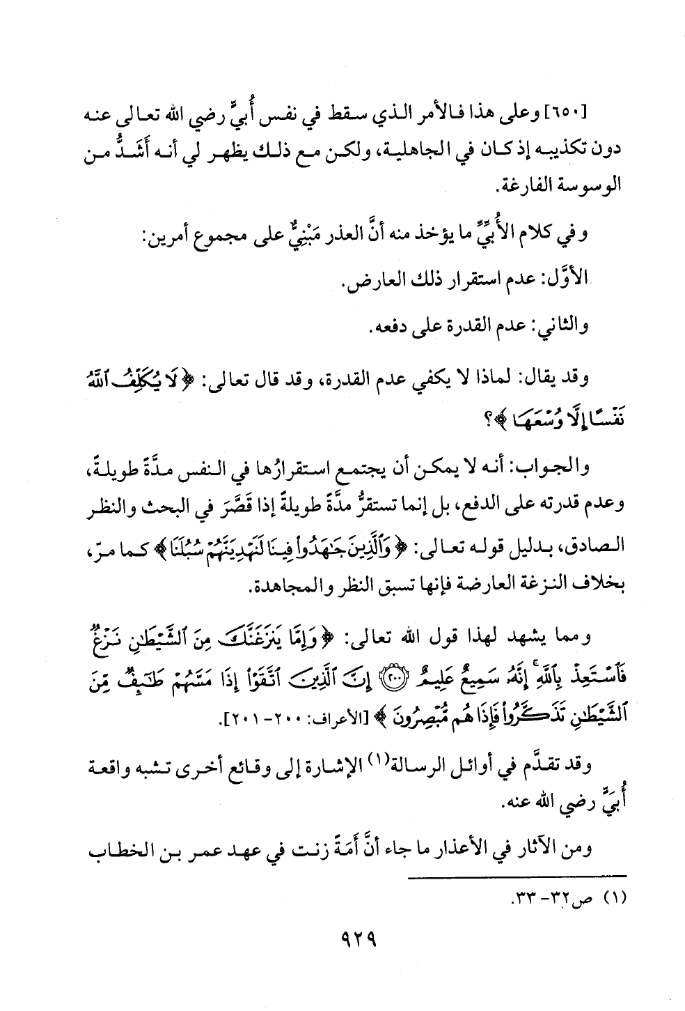 والجواب: أنه لا يمكن أن يجتمع استقرارُها في النفس مدَّةً طويلةً، وعدم قدرته على الدفع، بل إنما تستقرُّ مدَّةً طويلةً إذا قَصَّرَ في البحث والنظر الصادق، بدليل قوله تعالى: {وَالَّذِينَ جَاهَدُوا فِينَا لَنَهْدِيَنَّهُمْ سُبُلَنَا} كما مرّ، بخلاف النزغة العارضة فإنها تسبق النظر والمجاهدة.