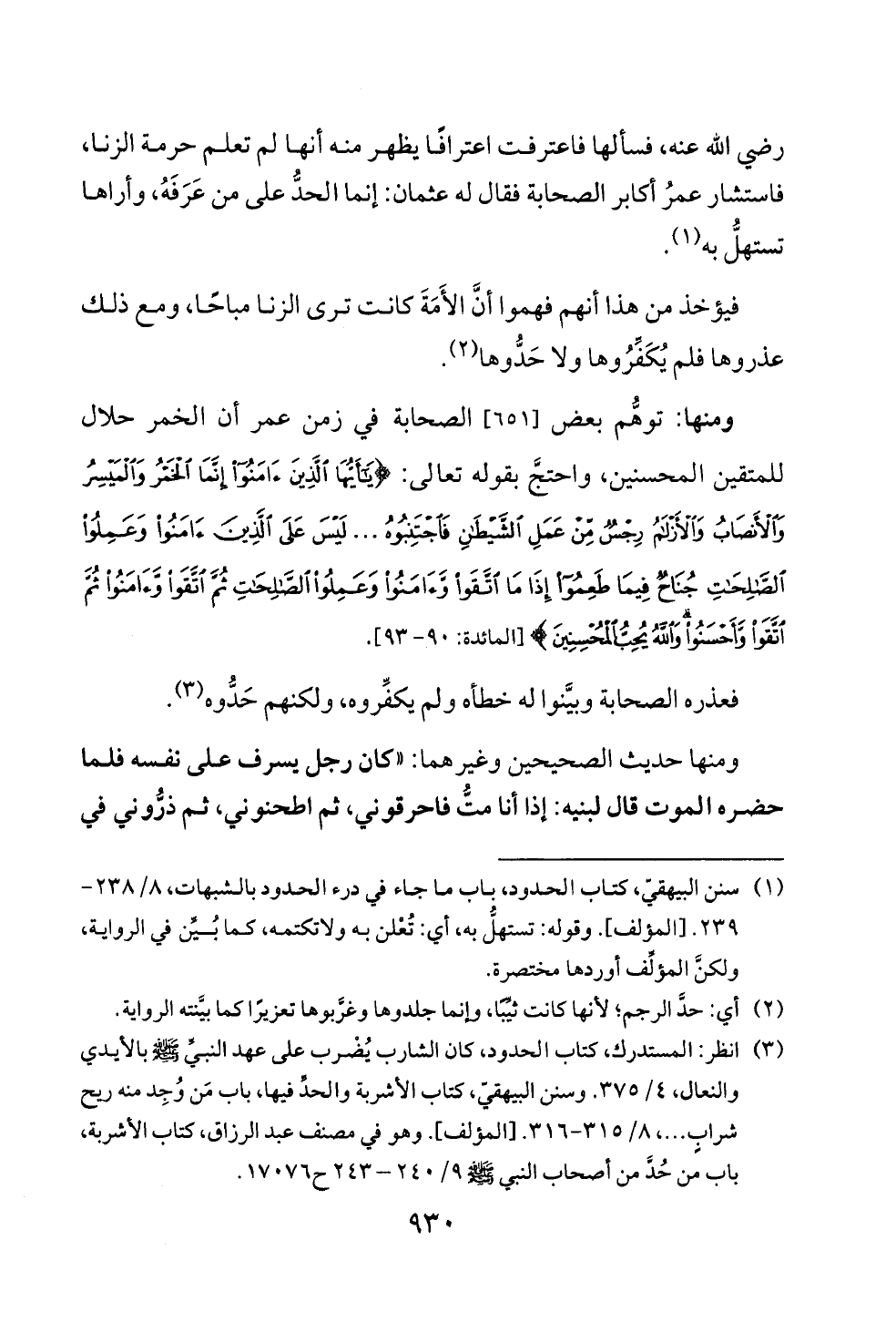 ومنها: توهُّم بعض [٦٥١] الصحابة في زمن عمر أن الخمر حلال للمتقين المحسنين، واحتجَّ بقوله تعالى: {يَاأَيُّهَا الَّذِينَ آمَنُوا إِنَّمَا الْخَمْرُ وَالْمَيْسِرُ وَالْأَنْصَابُ وَالْأَزْلَامُ رِجْسٌ مِنْ عَمَلِ الشَّيْطَانِ فَاجْتَنِبُوهُ ... لَيْسَ عَلَى الَّذِينَ آمَنُوا وَعَمِلُوا الصَّالِحَاتِ جُنَاحٌ فِيمَا طَعِمُوا إِذَا مَا اتَّقَوْا وَآمَنُوا وَعَمِلُوا الصَّالِحَاتِ ثُمَّ اتَّقَوْا وَآمَنُوا ثُمَّ اتَّقَوْا وَأَحْسَنُوا وَاللَّهُ يُحِبُّ الْمُحْسِنِينَ} [المائدة: ٩٠ - ٩٣].