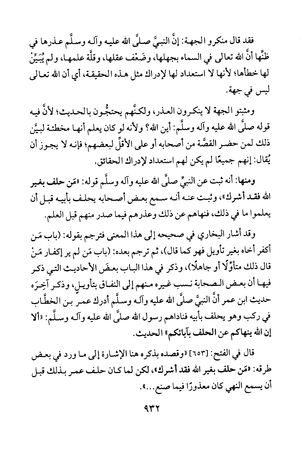 ومثبتو الجهة لا ينكرون العذر، ولكنَّهم يحتجُّون بالحديث؛ لأنَّ فيه قوله صلَّى الله عليه وآله وسلَّم: أين الله؟ ولأنه لو كان يعلم أنها مخطئة لبيَّن ذلك لمن حضر القصَّة من أصحابه أو على الأقلِّ لبعضهم؛ فإنه لا يجوز أن يُقال: إنهم جميعًا لم يكن لهم استعداد لإدراك الحقائق.