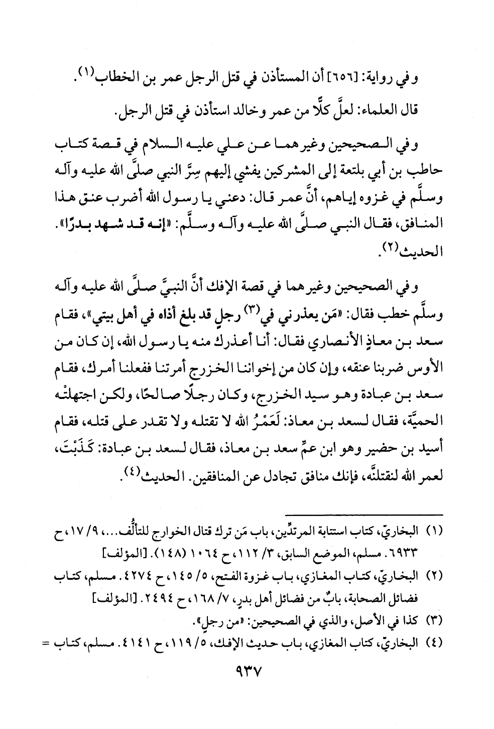 (¬١) البخاريّ، كتاب استتابة المرتدِّين، باب مَن ترك قتال الخوارج للتألُّف ... ، ٩/ ١٧، ح ٦٩٣٣. مسلم، الموضع السابق، ٣/ ١١٢، ح ١٠٦٤ (١٤٨). [المؤلف]