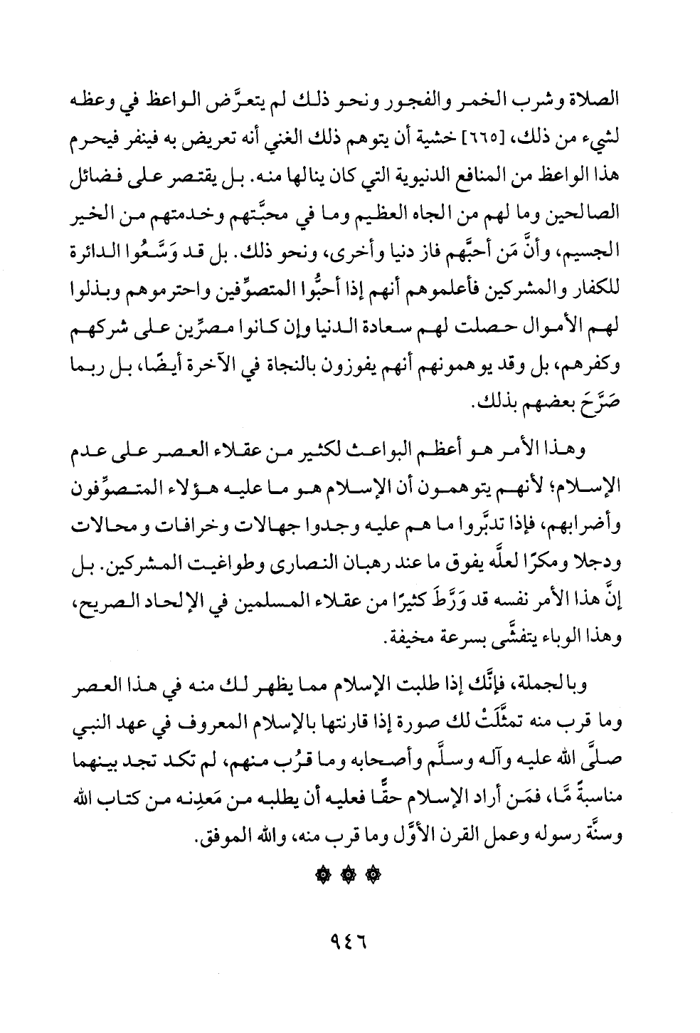 وبالجملة، فإنَّك إذا طلبت الإسلام مما يظهر لك منه في هذا العصر وما قرب منه تمثَّلَتْ لك صورة إذا قارنتها بالإسلام المعروف في عهد النبي صلَّى الله عليه وآله وسلَّم وأصحابه وما قرُب منهم، لم تكد تجد بينهما مناسبةً مَّا، فمَن أراد الإسلام حقًّا فعليه أن يطلبه من مَعدِنه من كتاب الله وسنَّة رسوله وعمل القرن الأوَّل وما قرب منه، والله الموفق.