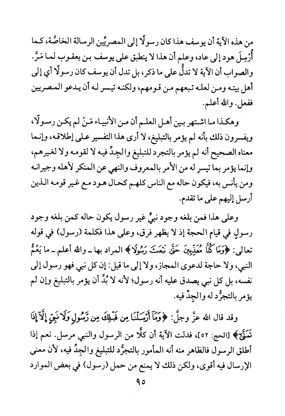 وقد قال الله عزَّ وجلَّ: {وَمَا أَرْسَلْنَا مِنْ قَبْلِكَ مِنْ رَسُولٍ وَلَا نَبِيٍّ إِلَّا إِذَا تَمَنَّى} [الحج: ٥٢]، فدلت الآية أن كلًّا من الرسول والنبي مرسل. نعم إذا أطلق الرسول فالظاهر منه أنه المأمور بالتجرُّد للتبليغ والجِدِّ فيه، لأن معنى الإرسال فيه أقوى، ولكن ذلك لا يمنع من حمل (رسول) في بعض الموارد