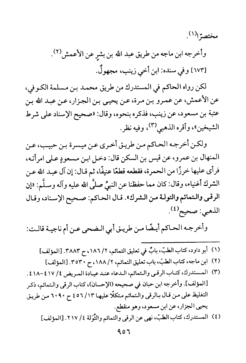 ولكن أخرجه الحاكم من طريق أخرى عن ميسرة بن حبيب، عن المنهال بن عمرو، عن قيس بن السكن قال: دخل ابن مسعودٍ على امرأته، فرأى عليها خرزًا من الحمرة، فقطعه قطعًا عنيفًا، ثم قال: إن آل عبد الله عن الشرك أغنياء، وقال: كان مما حفظنا عن النبيِّ صلَّى الله عليه وآله وسلَّم: «إن الرقى والتمائم والتولة من الشرك». قال الحاكم: صحيح الإسناد، وقال الذهبي: صحيح (¬٤).