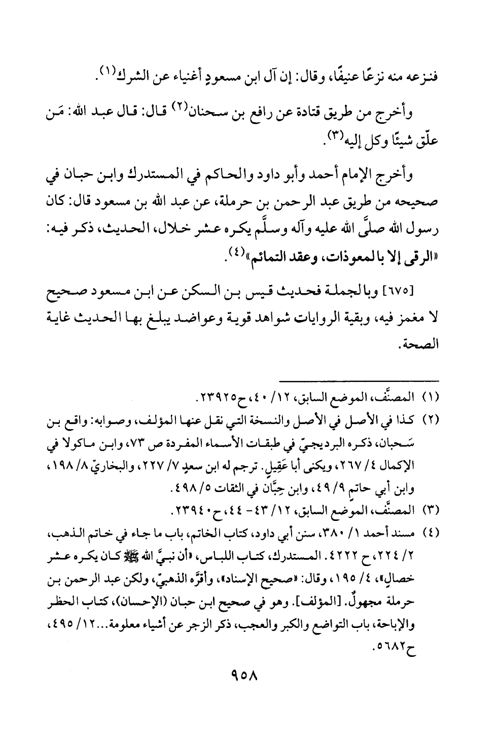 وأخرج الإمام أحمد وأبو داود والحاكم في المستدرك وابن حبان في صحيحه من طريق عبد الرحمن بن حرملة، عن عبد الله بن مسعود قال: كان رسول الله صلَّى الله عليه وآله وسلَّم يكره عشر خلال، الحديث، ذكر فيه: «الرقى إلا بالمعوذات، وعقد التمائم» (¬٤).