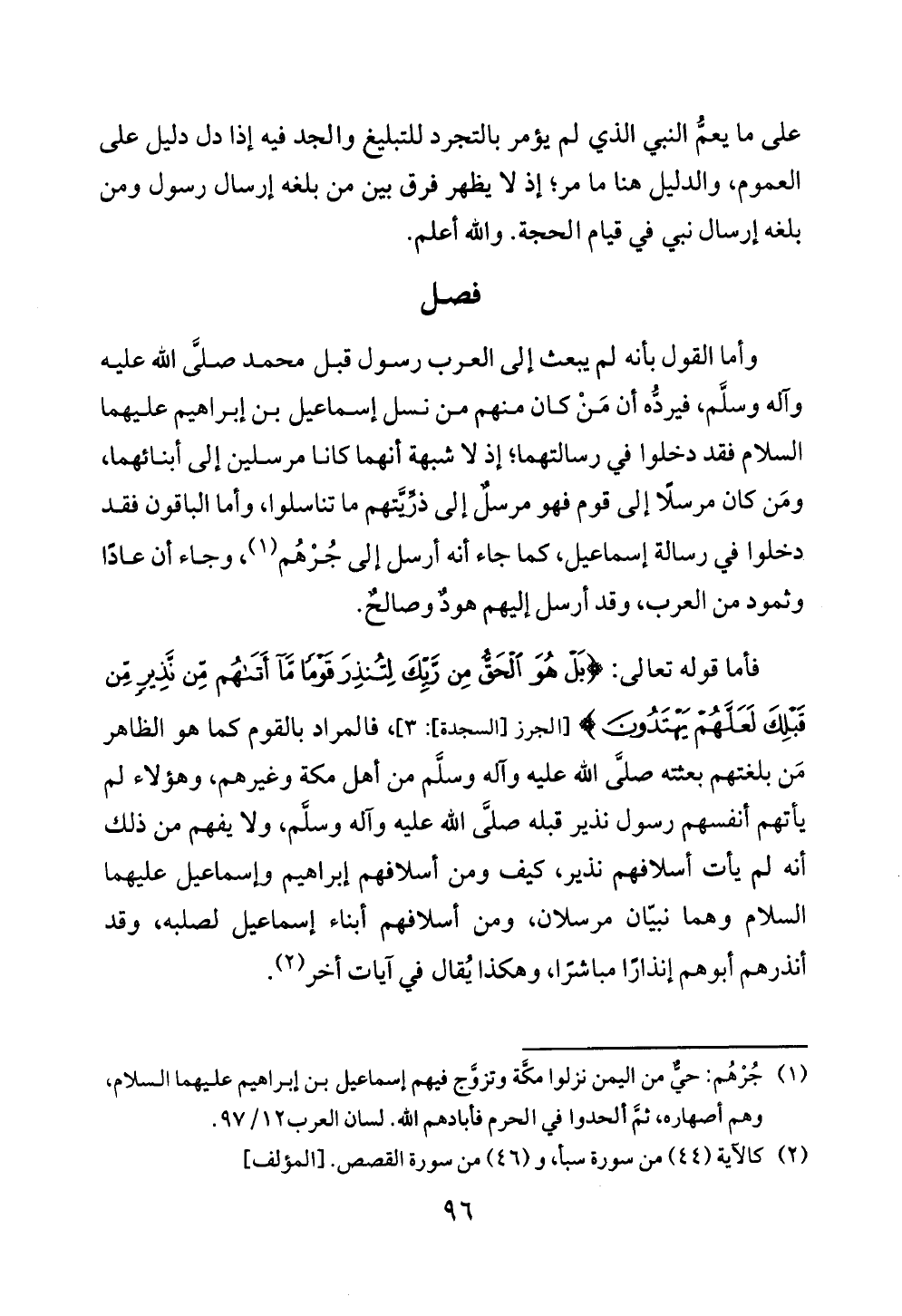 وأما القول بأنه لم يبعث إلى العرب رسول قبل محمد صلَّى الله عليه وآله وسلَّم، فيردُّه أن مَنْ كان منهم من نسل إسماعيل بن إبراهيم عليهما السلام فقد دخلوا في رسالتهما؛ إذ لا شبهة أنهما كانا مرسلين إلى أبنائهما، ومَن كان مرسلًا إلى قوم فهو مرسلٌ إلى ذرِّيَّتهم ما تناسلوا، وأما الباقون فقد دخلوا في رسالة إسماعيل، كما جاء أنه أرسل إلى جُرْهُم (¬١)، وجاء أن عادًا وثمود من العرب، وقد أرسل إليهم هودٌ وصالحٌ.
