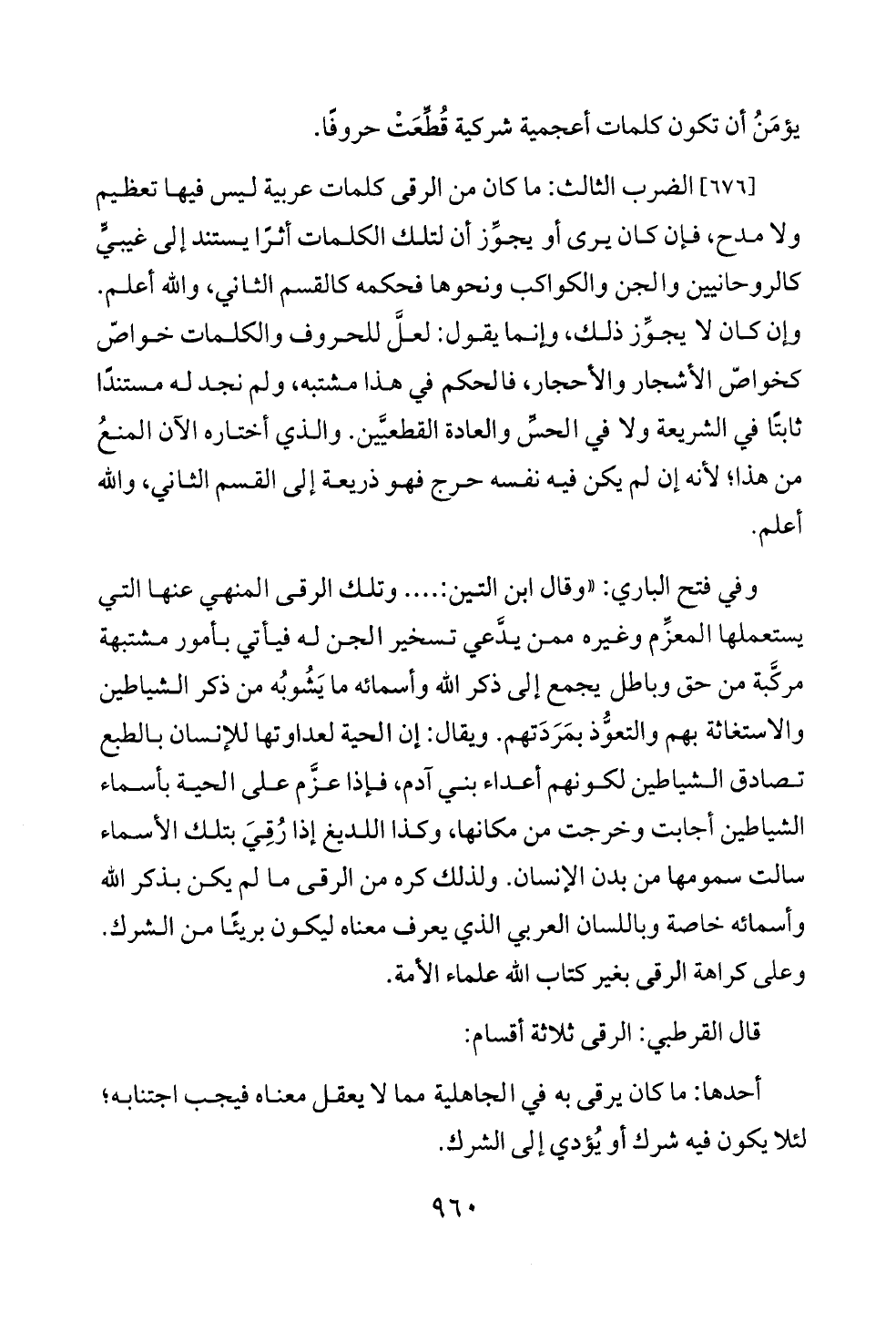 [٦٧٦] الضرب الثالث: ما كان من الرقى كلمات عربية ليس فيها تعظيم ولا مدح، فإن كان يرى أو يجوِّز أن لتلك الكلمات أثرًا يستند إلى غيبيٍّ كالروحانيين والجن والكواكب ونحوها فحكمه كالقسم الثاني، والله أعلم. وإن كان لا يجوِّز ذلك، وإنما يقول: لعلَّ للحروف والكلمات خواصّ كخواصّ الأشجار والأحجار، فالحكم في هذا مشتبه، ولم نجد له مستندًا ثابتًا في الشريعة ولا في الحسِّ والعادة القطعيَّين. والذي أختاره الآن المنعُ من هذا؛ لأنه إن لم يكن فيه نفسه حرج فهو ذريعة إلى القسم الثاني، والله أعلم.