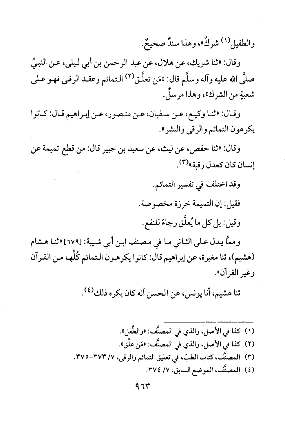 (¬٣) المصنَّف، كتاب الطبّ، في تعليق التمائم والرقى، ٧/ ٣٧٣ - ٣٧٥.