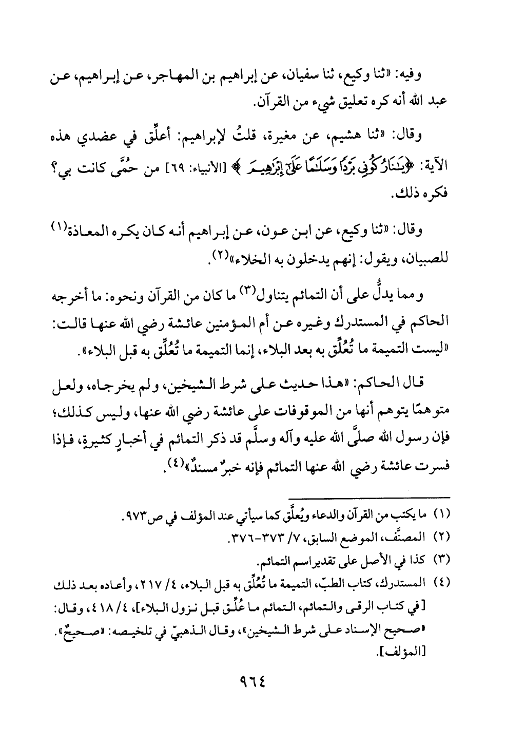 (¬١) ما يكتب من القرآن والدعاء ويُعلَّق كما سيأتي عند المؤلف في ص ٩٧٣.