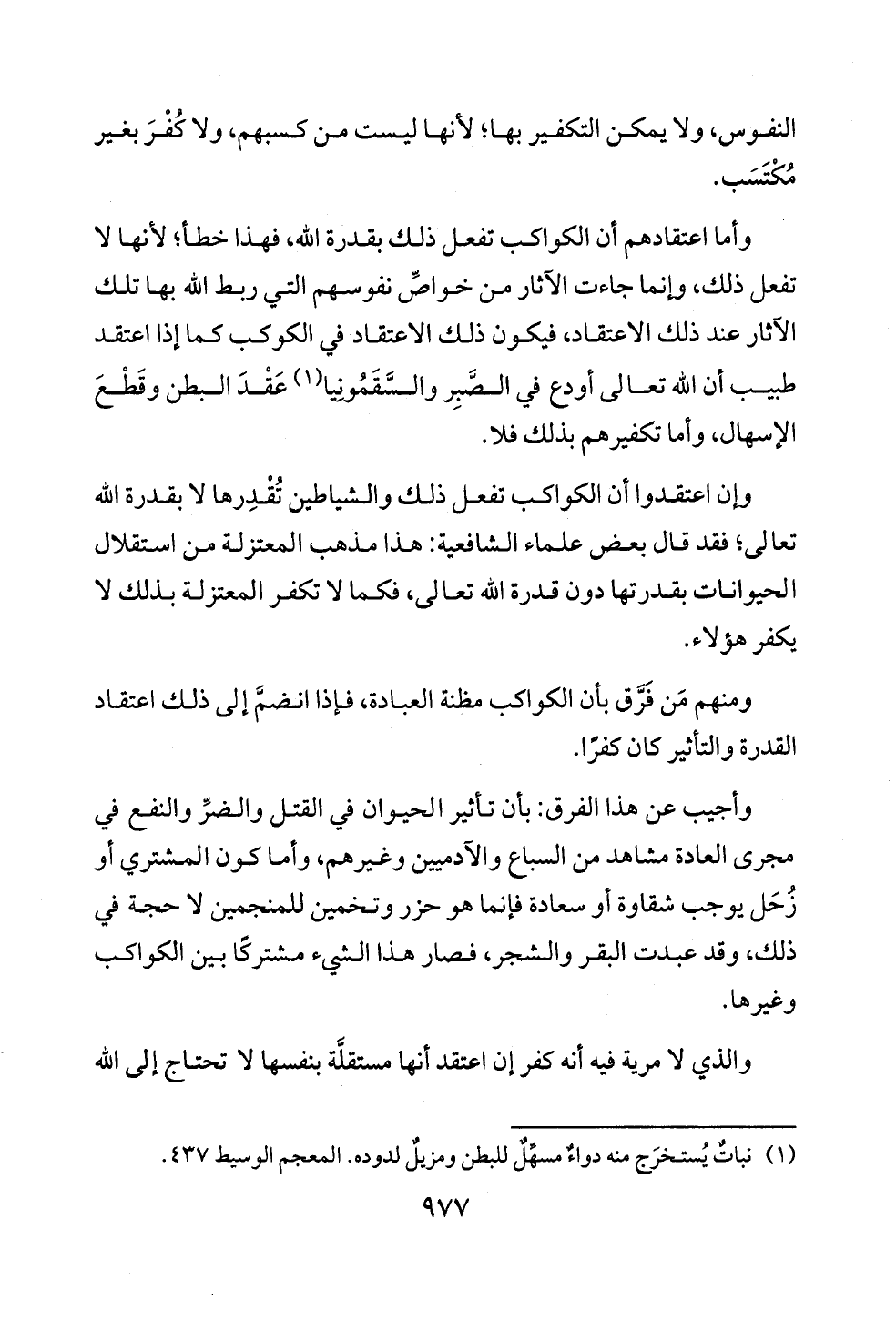 وأما اعتقادهم أن الكواكب تفعل ذلك بقدرة الله، فهذا خطأ؛ لأنها لا تفعل ذلك، وإنما جاءت الآثار من خواصِّ نفوسهم التي ربط الله بها تلك الآثار عند ذلك الاعتقاد، فيكون ذلك الاعتقاد في الكوكب كما إذا اعتقد طبيب أن الله تعالى أودع في الصَّبِر والسَّقَمُونِيا (¬١) عَقْدَ البطن وقَطْعَ الإسهال، وأما تكفيرهم بذلك فلا.