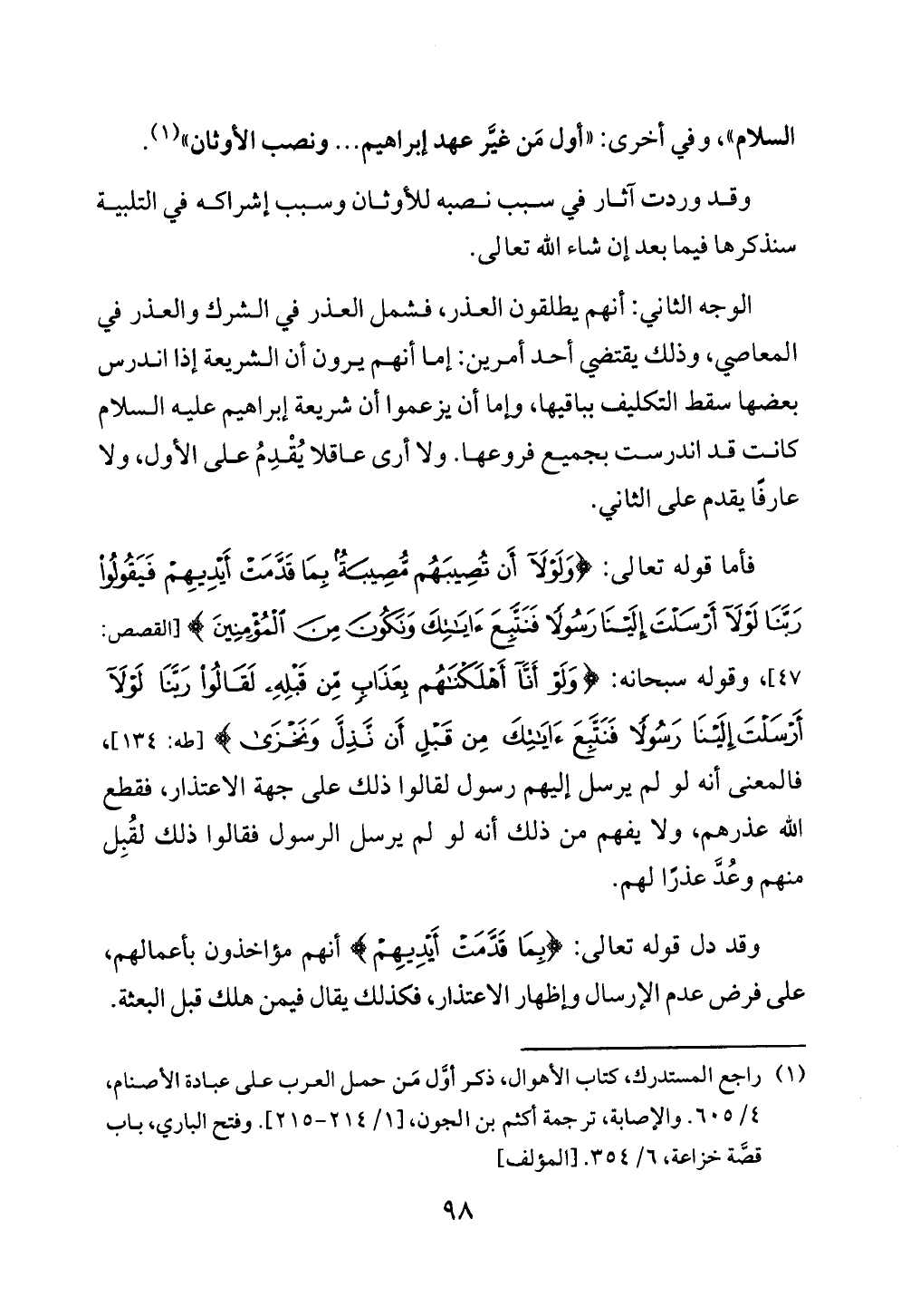 فأما قوله تعالى: {وَلَوْلَا أَنْ تُصِيبَهُمْ مُصِيبَةٌ بِمَا قَدَّمَتْ أَيْدِيهِمْ فَيَقُولُوا رَبَّنَا لَوْلَا أَرْسَلْتَ إِلَيْنَا رَسُولًا فَنَتَّبِعَ آيَاتِكَ وَنَكُونَ مِنَ الْمُؤْمِنِينَ} [القصص: ٤٧]، وقوله سبحانه: {وَلَوْ أَنَّا أَهْلَكْنَاهُمْ بِعَذَابٍ مِنْ قَبْلِهِ لَقَالُوا رَبَّنَا لَوْلَا أَرْسَلْتَ إِلَيْنَا رَسُولًا فَنَتَّبِعَ آيَاتِكَ مِنْ قَبْلِ أَنْ نَذِلَّ وَنَخْزَى} [طه: ١٣٤]، فالمعنى أنه لو لم يرسل إليهم رسول لقالوا ذلك على جهة الاعتذار، فقطع الله عذرهم، ولا يفهم من ذلك أنه لو لم يرسل الرسول فقالوا ذلك لقُبِل منهم وعُدَّ عذرًا لهم.
