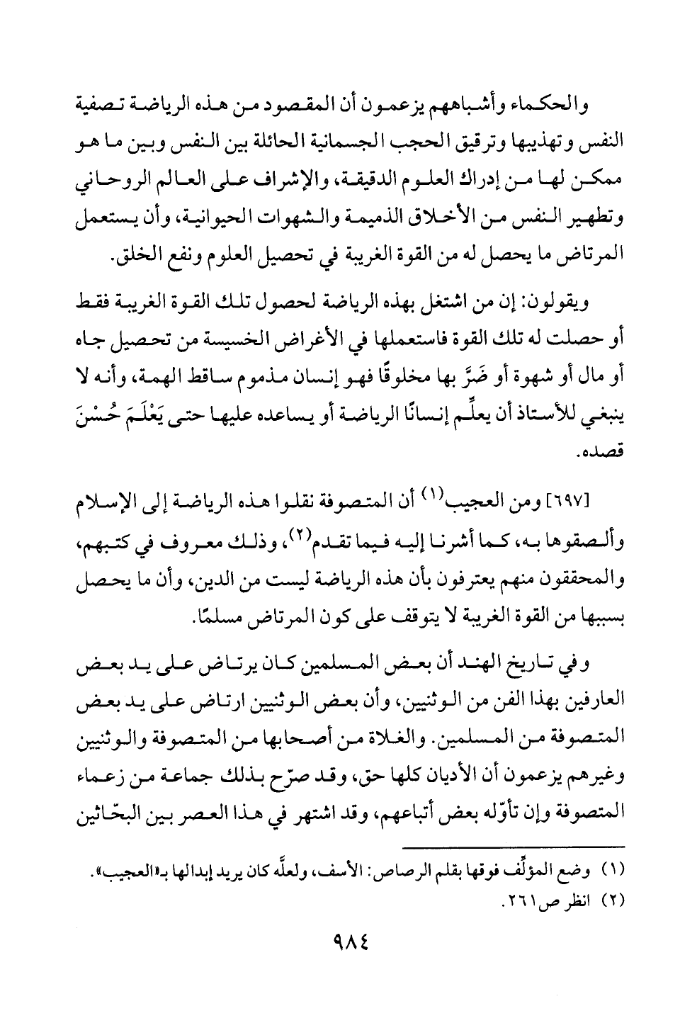[٦٩٧] ومن العجيب (¬١) أن المتصوفة نقلوا هذه الرياضة إلى الإسلام وألصقوها به، كما أشرنا إليه فيما تقدم (¬٢)، وذلك معروف في كتبهم، والمحققون منهم يعترفون بأن هذه الرياضة ليست من الدين، وأن ما يحصل بسببها من القوة الغريبة لا يتوقف على كون المرتاض مسلمًا.