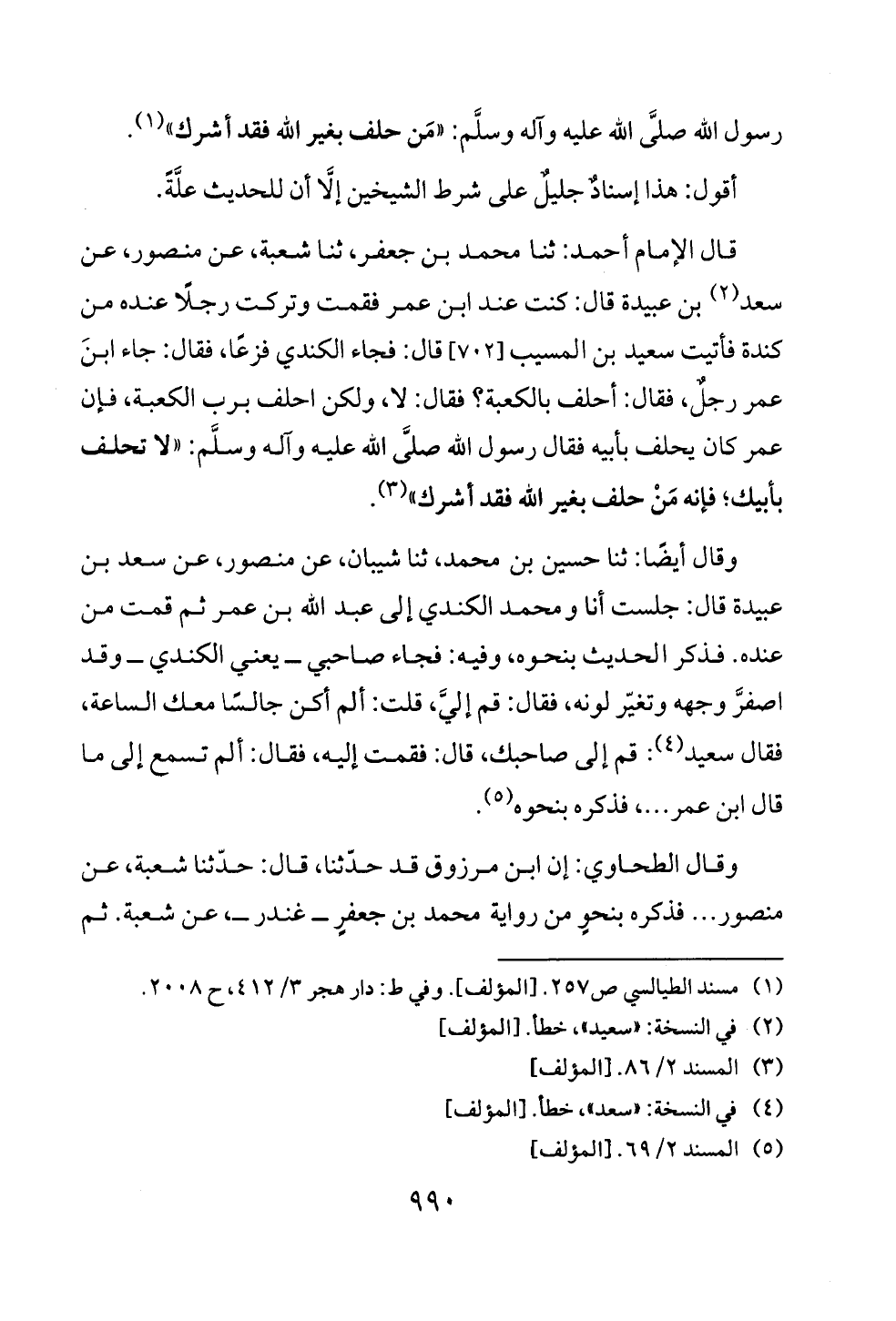 قال الإمام أحمد: ثنا محمد بن جعفر، ثنا شعبة، عن منصور، عن سعد (¬٢) بن عبيدة قال: كنت عند ابن عمر فقمت وتركت رجلًا عنده من كندة فأتيت سعيد بن المسيب [٧٠٢] قال: فجاء الكندي فزعًا، فقال: جاء ابنَ عمر رجلٌ، فقال: أحلف بالكعبة؟ فقال: لا، ولكن احلف برب الكعبة، فإن عمر كان يحلف بأبيه فقال رسول الله صلَّى الله عليه وآله وسلَّم: «لا تحلف بأبيك؛ فإنه مَنْ حلف بغير الله فقد أشرك» (¬٣).